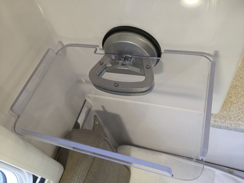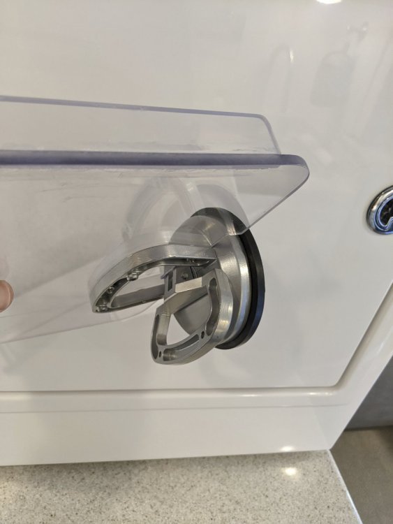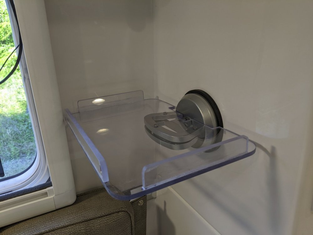 Inspired by dhaig's use of a Harbor Freight suction cup to make an external towel rack, I decided to use another Harbor Freight suction cup, https://www.harborfreight.com/4-58-in-aluminum-suction-cup-lifter-110-lb-57500.html, to make an interior shelf. I fabricated the shelf out of a 1/4" sheet of polycarbonate. I'm using the shelf to hold a CPAP machine on the back side of the pantry cabinet of our standard bed Elite 2 but the suction cup shelf could be adapted to a number of different applications depending on a person's need. The suction cup is rated for 110 Lbs. Of course this is a straight line pull and not side loaded like it is in this shelf application, but that said, the shelf is quite secure and can support quite a bit of weight.