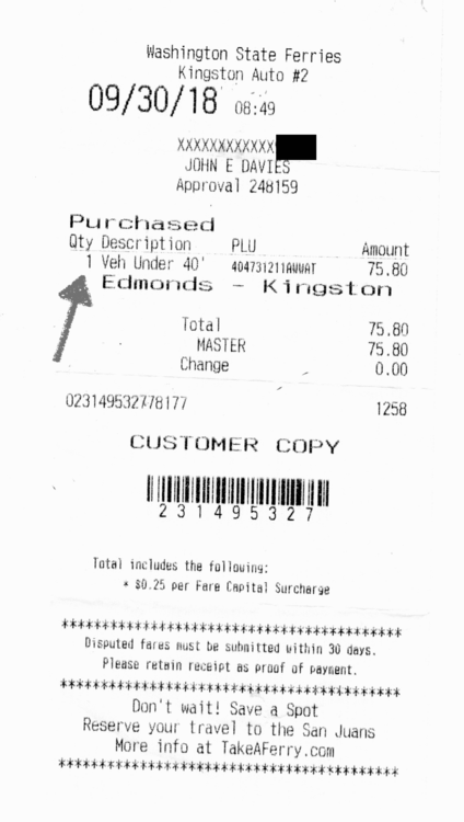 Queued up last week at the Kingston WA ferry dock, before crossing to the Seattle area: The ticket taker took a single glance out his window, saw white fiberglass and wrote up the fair as "Under 40 ft" [attachment file=Oliver Ferry ticket.png] which saved us the price of a fast food meal... I don't know if he noticed that the Ollie was longer than "normal" as we passed by. [attachment file=Ferry Fares.png] I was hoping we could park at the extreme front end of the ship (it is not called the bow because the ships sail in both directions) so I could take some cool pics, but Mouse was buried deep inside. Taking the ferry is fun, saves about 90 minutes driving and 60 miles of gas in heavy traffic, and makes for a great way to get to or from the Olympic Peninsula and the National Park/ Pacific ocean beaches area. [attachment file=wsf route map.pdf] It is EXTREMELY IMPORTANT that you time your passage so that you are not at peak rush time. We intentionally chose mid-morning on a Sunday, and there was zero waiting traffic to cross east to Seattle. Late in the afternoon would have been a different story.... If you don't study the schedule, you may end up waiting for several hours in a miles long line of RVs and day tourists. It can be very frustrating if you don't plan well. John Davies Spokane WA wsf-route-map.pdf