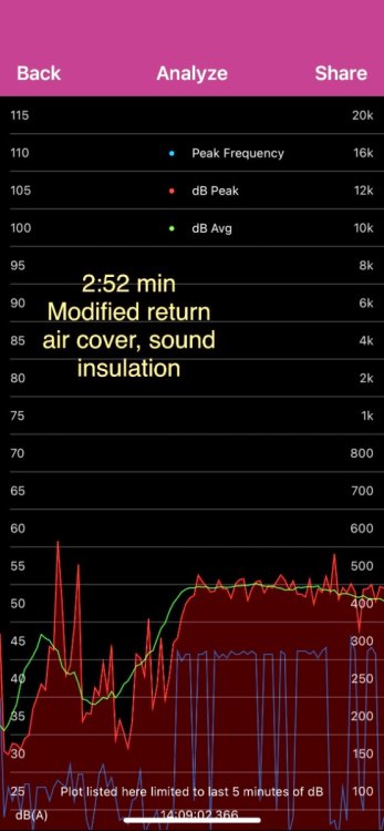 I have been really mad at how noisy my furnace is, it drives one of my dogs completely nuts. I plan to do an extensive thread on the changes, but I am not done yet, and I have some return airflow testing to do using HVAC smoke matches. I used a free sound meter app on my iPhone 13 Mini, so the actual numbers are probably not real accurate. I used these settings: I set my iPhone on the street side bed platform with the mic facing the furnace grill, and I put the two fiberglass access covers and the mattress in place over the furnace. (10” thick optional mattress.) I started recording, walked to the thermostat, started the furnace, let it run for about a minute, then let it shut off automatically before turning off the recording. There were no extraneous outside noises, the test was done inside my RV garage. Here is the initial test: Here is the final test: Before the mods, the furnace was irritating and screechy. Afterwards, it sounded a little quieter, but more importantly, it was much more even and mellow. I am nor sure how to interpret the graphs, but it appears that the peak red sound levels (dBa) are reduced, and the peak blue max frequencies are HUGELY affected, the peaks drop from 3000 hz all the way down to 300 hz. (!!!) And the green average sound level goes from a crazy pattern to a mellow even one, way lower…. I think that change is what I am hearing. My dog will like it. Comments welcome, especially from an engineer. FYI, if you want to get a feel for how much nicer it can be, find a high density foam pillow and stuff it hard over your return air grill. My mods are quieter… John Davies Spokane WA