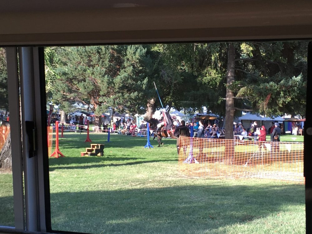 This weekend my daughter and I boondocked in Kennewick (Tri Cities) WA. She is a member of a jousting club that performs at medieval faires. She does not ride, thankfully, she is a "squire" who assists on the ground, handing up new lances and picking up broken shards after the knights impact each other with a splintering crash. This is the spot I picked at Columbia Park, where the hydro races are held each summer: Here is the view out the back window, most unusual for a boondocking site! The List was about 200 feet away. Here is her group, they will be performing in Spokane in two weeks. https://www.facebook.com/joustalliance/ If anybody is in the area Oct 7 or 8, consider stopping by for a visit. It's a little silly but lots of fun. Look for my Ollie in the Actors camping area, near the horse paddocks and field. https://www.spokanerenfaire.com She also participates in another group called Combat Corps. She does sword fighting displays, Hollywood style. https://www.facebook.com/combatcorpsspokane/?ref=py_c Mouse is a wonderful help to her. Previously she was sleeping in the back of my Ram pickup or her Outback. John Davies Spokane WA