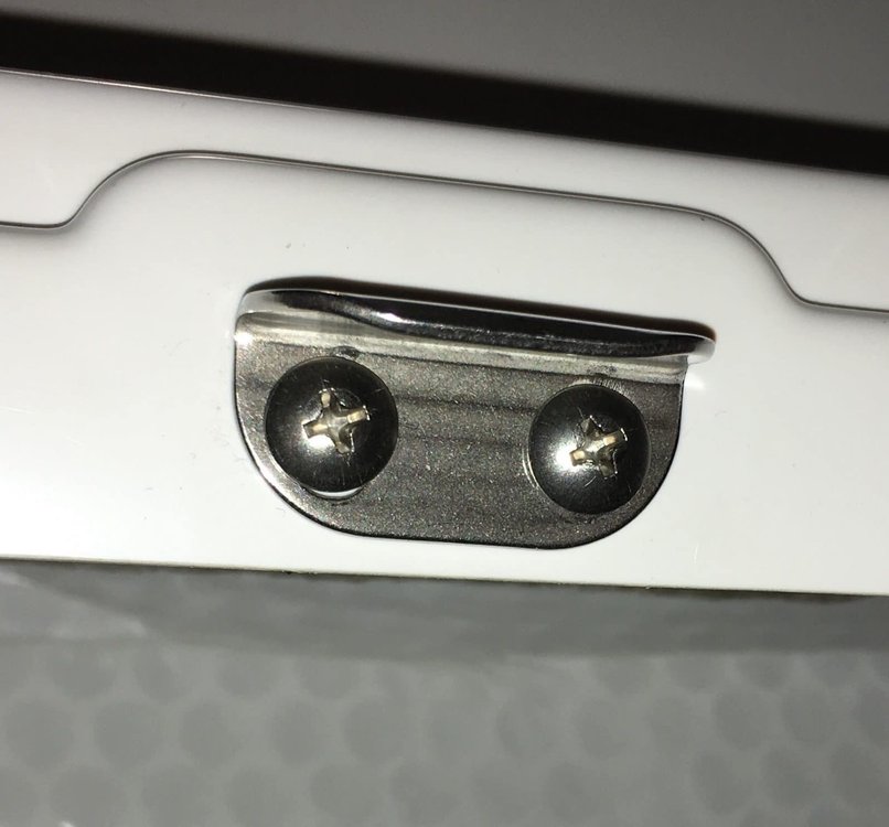 I started finding stray hardware in my overhead cabinets, I took a closer look and found this: The holes are sized for a number 8 screw. The installed hardware is a number 4 FINE thread screw with a number 6 COARSE thead plain nut run down it. Whoever did this had his head in a very strange place indeed. The plain nuts rattle loose and the screws fall out. Then your expensive door can bang open and break out the hinge screws or worse. Simply unbelieveable! Here are the 8-32 x 3/4 stainless panhead screws and nylock (self locking) nuts that I installed. The washers are optional: For most of the latch plates I was able to get them to adjust back far enough to eliminate play. Some ran out of adjustment (probably the reason the too-small screws were installed) so for those I ground part of the head off the screws and also filed the slots in the brackets a little longer, so I could get more travel back.. I also checked and tightened as needed all the hinge screws. Please check your hardware, let us know here if you find the wrong size installed. Thanks, John Davies Spokane WA