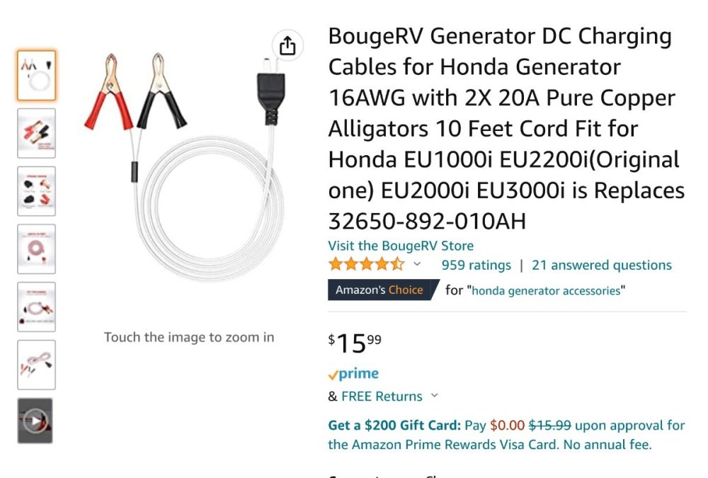 You need a 30 amp RV female to 15 amp male adapter, this is the one I use. It is high quality and won’t melt: You can plug its male end into your generator and then plug the big 30 amp shore power cable into the female end. But it works much better if you plug a heavy duty (12 or 10 AWG) 15 amp extension cord into your generator, then in to the adaptor, and attach the adapter to the side of the trailer using the threaded collar. That way you don’t have a massive cord dangling off the fragile generator socket. The grounding plug is needed, it has to plug into one unused socket on the generator in order for the onboard surge suppressor to “see” the generator and then allow it to connect properly. If you don’t use that plug it won’t work right. Another option if your generator has a 12 volt DC connection, use the supplied cord with aligator clips and hook those to (any of) your battery positive and negative posts. But this is a a VERY slow way to charge and also little risky for a few reasons. It should look like this: Maybe you could just tell us what equipment/ adapters, etc you have at hand, hopefully you won’t have to make a trip to an RV supplier…. And I will say this, you are supposed to figure this stuff out in your driveway, not out in the remote woods 😀 John Davies Spokane WA -