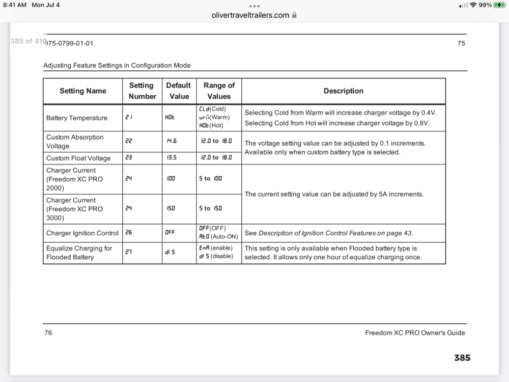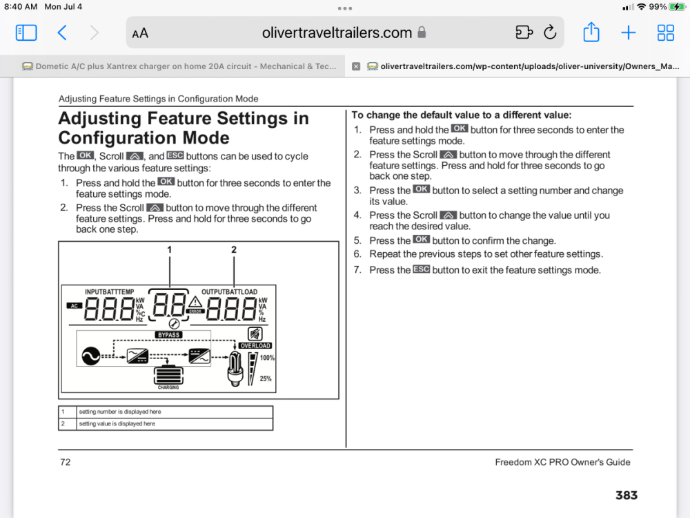 There have been a few threads about this, you can turn down the charge rate in your charger settings so that it doesn't draw so much power. I am sure somebody will provide a link, or you can just go look at your setup menu. Here are a couple of pages from the manual. I personally would initially reduce the charge rate by 50% when at home with your 20A circuit, and you can go further than that if your AC is still making an overload condition when it kicks on. Record the original setting so you can go back to it. Though it may not have been set correctly by Oliver. If not, file a Service ticket to alert them. Keep in mind a 10 amp charge current will work just as well as a 100 amp current, it just takes 10 times longer. 😬 At home there is NO need at all to charge your lithiums at a full rate, but that is fine if you are connected to a 30 amp circuit while traveling. One other possibility is a faulty breaker in your house, if you continue to have issues, go look there, and replace it if needed. the newer AFCI (arc fault circuit interrupters) are cr@p and they will trip if you look at them sideways. My washer is in one, it works fine for months, then it will trip the AFCI three times in a row, before returning to normal. Loose electrical connections in an outlet can also cause that, rewire any “back stabbed” outlets so the wires go onto the screw terminals You can also replace a AFCI with a traditional circuit breaker, but that is against code most places.. I wouldn’t do anything in this last paragraph unless turning down the charge rate is unsuccessful! If you don’t have one already, buy a 20 AMP watt meter like this one to see what is actually coming OUT of your outlet. … P3 International P4460 Kill A Watt Ez Energy Monitor … FYI most of these units only read to 15 amps! John Davies Spokane WA