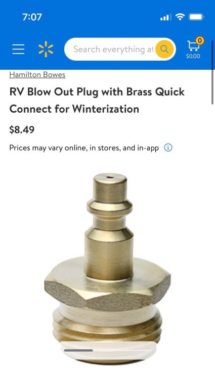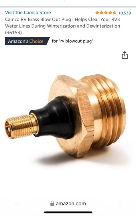 Blowout stopper? Same as blowout plug or blowout adapter? I haven’t heard the term before. You can’t drain water tanks, any of the three in an Ollie, with compressed air. They are all vented to the atmosphere so they won’t expand and cause damage. They don’t need to be completely empty regardless, because a small amount on the bottom can freeze and it won’t hurt anything. Maybe, maybe not - the three dump valves might possibly get damaged….. thus the need for a small amount of RV antifreeze in the two nasty tanks, after they have been drained. FYI the over the counter plugs you buy do not work especially well, the Schrader valve type is really restrictive And the quick disconnect type is even worse: Both are designed to maybe not explode your water system if you accidentally connect it to a big 150 psi high volume compressed air source. But at 60 psi you just don’t get much flow. You should remove the core on the first one and throw it away, or drill out the hole as large as possible for the second type, and always make sure your air source is adjusted correctly. The goal is a large volume at low pressure, not a small volume at high pressure! Remember to carry one and an appropriate compressor all the time, don’t leave them at home, you might get caught by an unexpected arctic blast even in Summer. John Davies Spokane WA