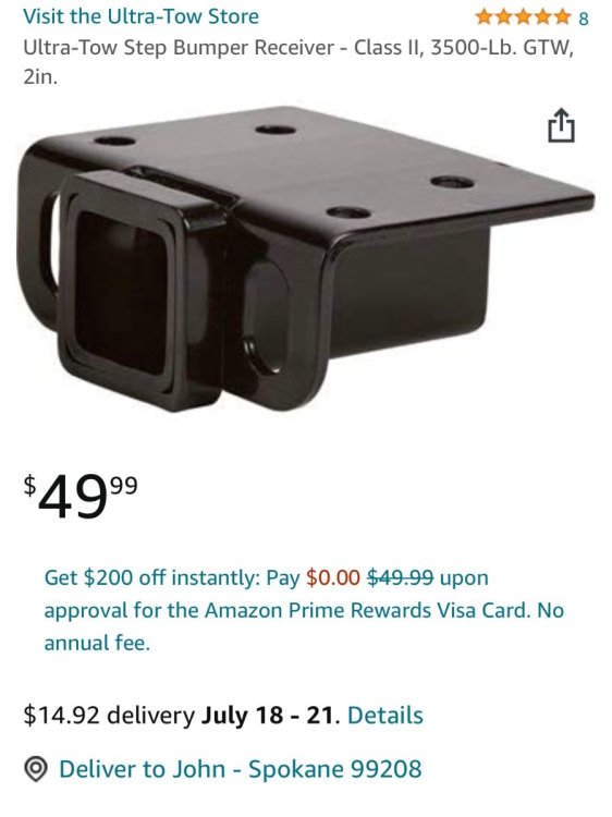 I wouldn’t want to trust an adapter, there have been threads here about changing the small Ollie receiver to a steel 2” one. Once you do that the choices for a cargo rack are many, Just be sure to pick an RV rated one. I really like my 1-Up bike racks and would buy one of their folding trays in a heartbeat. What are the dimensions of your tank? Will it obscure the rear trailer lights? I would install this: Ultra-Tow Step Bumper Receiver - Class II, 3500-Lb. GTW, 2in. Then use one of these: https://www.1up-usa.com/product-category/cargo-carriers/ Alternatively have you thought about a front receiver for your truck? Carry the tank here, it would be out of the way as long as you always remember it is there😳 An extra benefit is you can use a front ball mount to maneuver your trailer, just not at the same time…. John Davies Spokane WA -