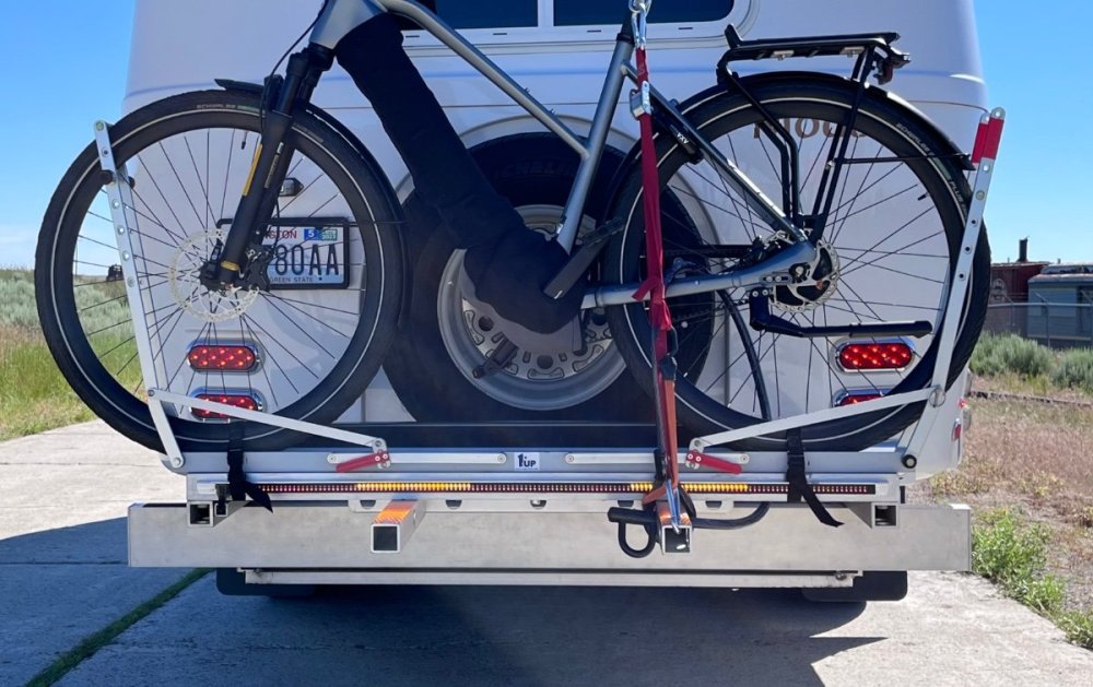 That is one big advantage of a HD pickup, you can get rid off the Andersen and use one of those.... Just make sure the ball and mount are both rated for at least 7500 pounds and keep the front of the Ollie light (no big generator in a cargo tray). The weight of the bikes and their rack and the ball mount all count toward the tongue weight. What is the max TW rating for that Curt ball mount? 750? Two typical 60 pound ebikes and an ebike rated rack with swing out adapter could use up 200+ pounds of TW (with the batteries removed). For a loaded LE2 (with a typical TW of 650) that is going to be way too much. For example, this swing-out mount weighs 58 pounds by itself, an aluminum Super Duty Double rack weighs 47 pounds. Steel racks are quite a bit heavier. John Davies Spokane WA