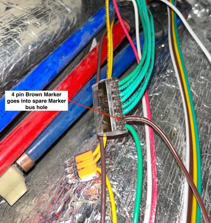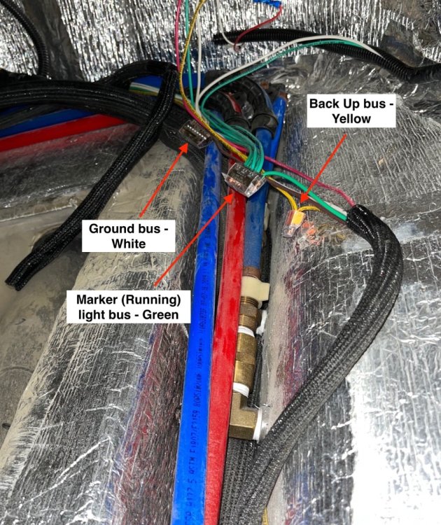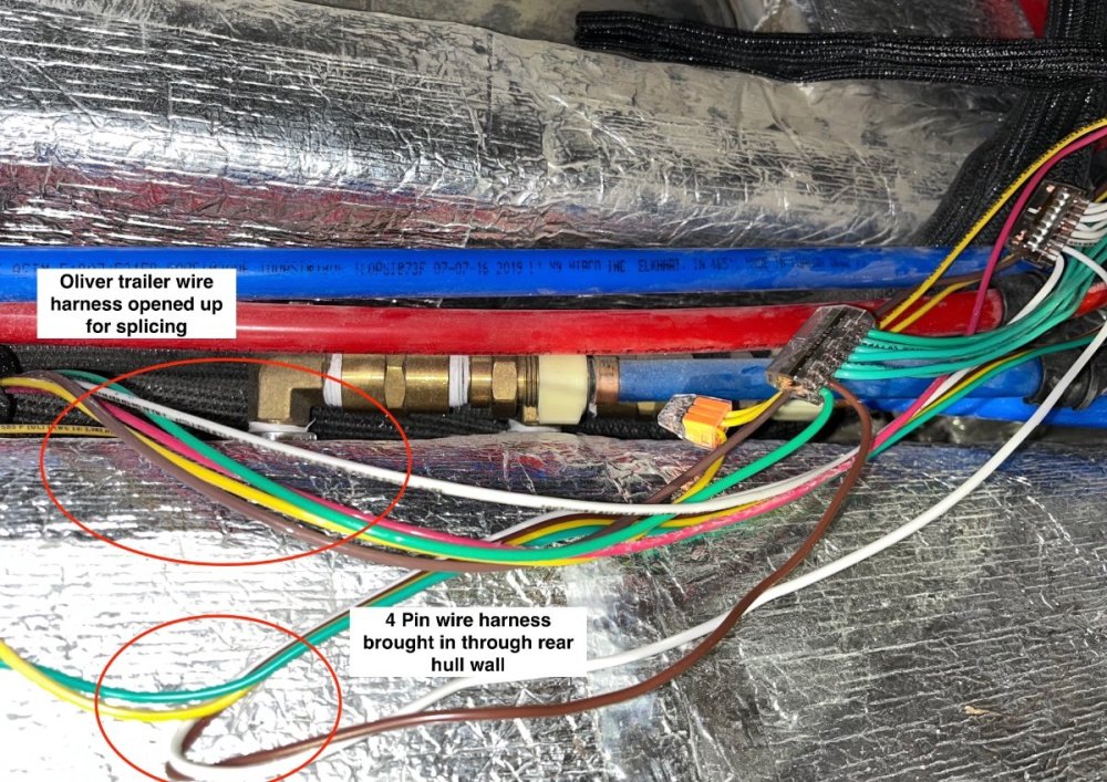 If you have blocked your tail and brake lights for some reason, with a big cargo box for example, you need to add aux lighting to be safe and legal. I added an LED light bar here: ... https://olivertraveltrailers.com/forums/topic/6848-how-to-add-a-full-width-led-light-bar-to-your-bike-rack-when-your-bike-blocks-the-trailer-lights/ The factory wires are easy enough to access underneath the rear cargo floor, near the side door, but the colors do NOT match "industry standard" color coding. Not even close. This is based on my 2017 LE2, yours may differ. Oliver stopped providing wiring diagrams a few years ago, please complain to Sales! I made this chart showing the differences. Why they did this is beyond comprehension. This is from the lightbar thread, it shows the CableClam in the exact location of the left round red reflector. Be VERY careful drilling holes here ... ... because directly on the other side there are water lines and electrical cables: To access the wires, remove the rubber floor sheet and the several tiny screws holding down the floor panel. Remove any cable ties, black electrical tape and peel away the protective split loom material. You will see some wire buses and also the two water ports and check valves. My two larger buses each had a free spot, so I could just strip the appropriate wire and push it into place. The other three wires had to be spliced directly into the Oliver wires. A little confusion here, the separate LED light bar Back Up wire was white, so it is important to keep track of the wire's purpose - function supersedes the actual color at all times! AFTER testing to make sure all your lights work .... OLIVER Bike Rack LED Light Bar Initial Test .... reinstall the split loom and secure everything well with nylon wire ties. Don't forget the big bundles that run along the back wall, mine were completely loose. Double check your lights to make sure they still work. Put the floor and rubber sheet back in. Go have a beer. I hope this helps. It is infuriating when colors do not match industry standards. ESPECIALLY IF YOUR TRAILER MANUAL HAS NO WIRING DIAGRAMS!!! John Davies Spokane WA