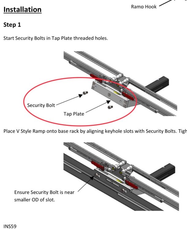 Well, never mind. I ordered the "tap plate" plus the security bolts that the ramp attaches to on the regular Super Duty rack, it will work great to secure the ramp on my setup. You just slide on the ramp "keyhole" slots and tighten the bolts with a special allen wrench that has a pin in the center of the hole. John Davies Spokane WA