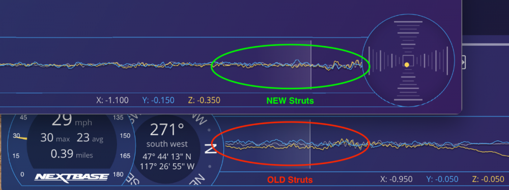 I have a NextBase 422GW dash cam that records G forces, that is supposed to be in case of an accident, it shows how fast you were going, how hard you were braking, whether you made an evasive maneuver, and so on, in three axises. At 145,000 miles my front struts were leaking and the handling was a little squirrelly, so I drove across the worst road around here at a steady 30 mph with the cruise control operating, then immediately after the struts were replaced. Here is the results, one screen capture stacked on top of the other. The truck feels much better, more "planted", and the G forces are significantly less. The vertical white lines indicate the same position on the road. I don't know why I bothered with this, but it is cool to see the difference. Have a nice day. John Davies Spokane WA