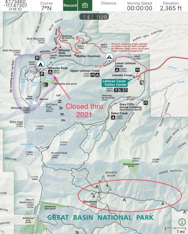 I am researching Great Basin and ran across this Elite pic, at Baker Creek Campground. Does anybody recognize it? I camped at Upper Lehman Creek a few years ago, very late in the camping season, it sucked. It was overgrown, dark and close to traffic on the main road. I really want to return to this wonderful park and stay at the 10,000 ft Wheeler Peak CG, but it is closed for the year, for reconstruction. Can anyone comment on the Baker Creek CG (reservable) or the primitive campgrounds along Snake Creek (first come first serve)? Any suggestions for scenic boondocking spots outside the park? Those southern sites are on rough roads. “Snake Creek may be closed due to snow in winter months, check our current conditions page for uptodate infomation. High clearance vehicles are recommended for these rough, dirt roads. RVs and trailers are not recommended at any time.” Are they in fact too nasty for an Ollie and a 4wd TV? There are high clearance 4wd roads on the east edge of the park (dashed grey lines), has anybody driven them without a trailer? Comments? It looks as if my planned Alaska trip is on hold, so I will head south instead, or stick around my neighborhood - MT, WY, and ID…. weather and fire smoke permitting. Thanks, John Davies Spokane WA