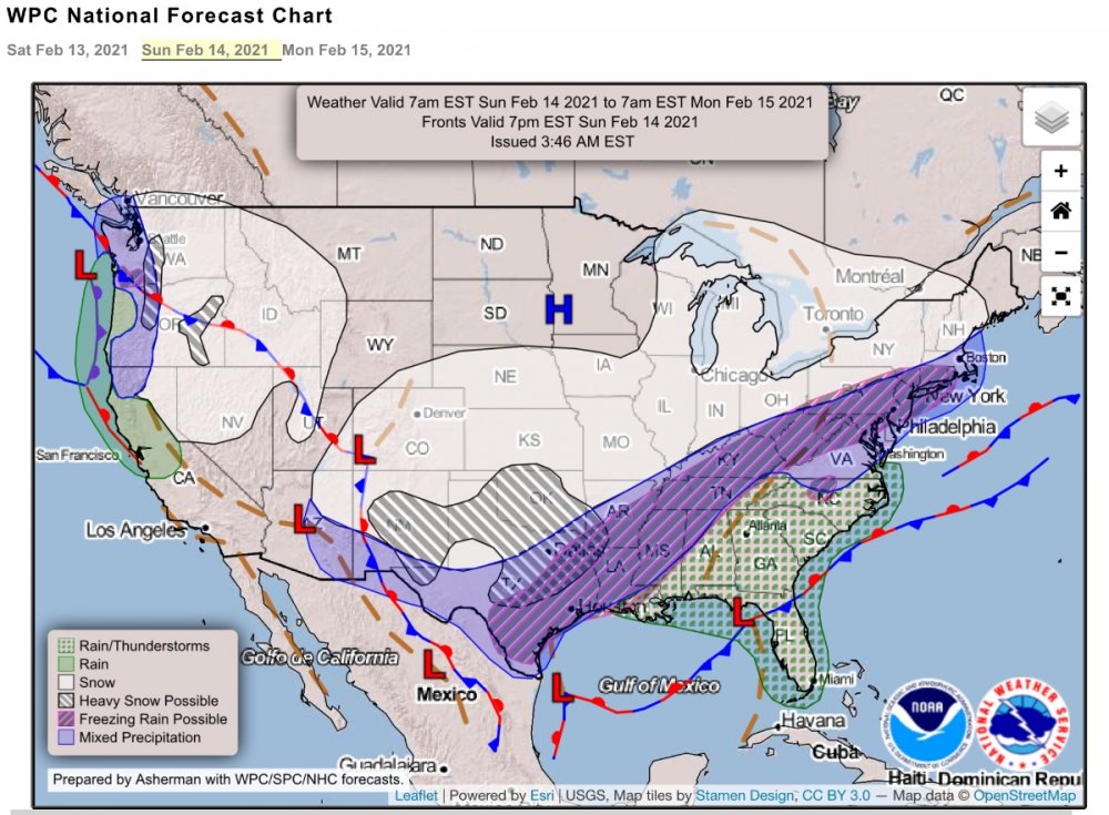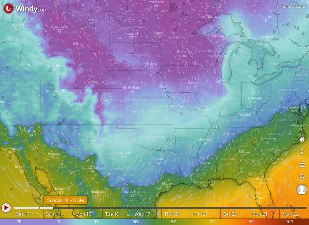 This is an interesting shot from the NOAA “predictive” weather site. I really like the old school graphics showing the fronts. I don’t recall ever seeing this much chaos spread all over the USA at one time, keeping in mind that the one solitary “H” represents the middle of the Polar Vortex. I think Sunday would be a good time to just hunker down and binge watch cable TV, if you still have power. NOAA Weather Prediction Center And here is a screen cap from my Windy app, showing temperature. https://www.johnnyjet.com/windy-best-free-weather-app/ So far in NE Washington we have missed all but some single digit night time temperatures, no snow, ice, or wind storms. No snapped trees or multi-car crashes. Stay warm and safe. John Davies Spokane WA