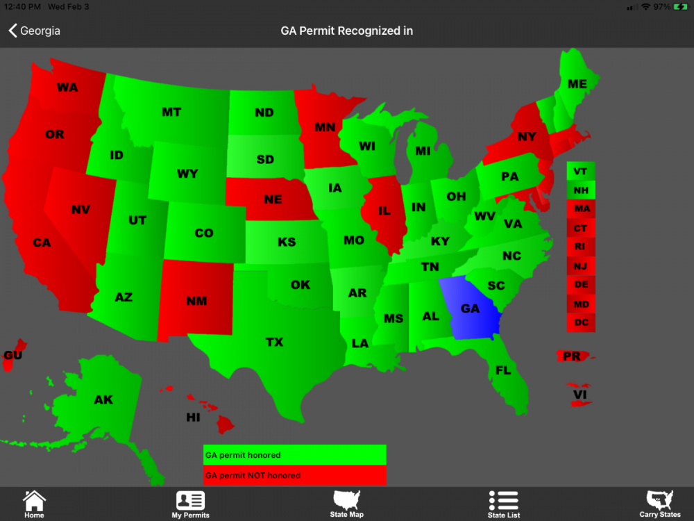 You are pretty much screwed when visiting CA and OR, the latter does issue non-resident permits, but you have to visit in person one of the few friendly county (rural Eastern OR) sheriffs who are willing to do that, and you have to also renew it in person after four years. Which is kinda difficult if you live 3000 miles away as you do.... You should check out theUtah Non Resident Concealed Carry Permit, it is easy to get and renew by mail, as long as you take and pass a certified beginner’s shooting class (they require a signed certificate when you apply). It is good in WA and NV, plus NE which is not on your list. That is a lot of hassle and expense for just three more states....Here is a screen shot of the states that honor your GA permit. And here is the UT map: I have both a WA permit and a UT non-resident one, and I try to travel just where they honor them. Keep in mind, a WHOLE bunch of western states allow open carry, though some cities restrict it by local ordinance. When you are boondocking or hiking in the mountains, use a side holster and don’t cover your gun when you are around anybody. When I open carry, it is with a Ruger SP101 .327 Federal Magnum in a tan leather OWB holster, since it is bright stainless steel it looks fairly innocuous and not at all “scary” to the uninformed onlooker. But it is big medicine for human and smaller animal predators with the right ammo, it has about 500 ft lbs muzzle energy. You need something a lot bigger for a remote camp, a .44 Mag or bigger long gun works. ... https://olivertraveltrailers.com/forums/topic/1994-how-to-santa-cruz-locking-shotgun-mount-in-the-closet/ John Davies Spokane WA Spokane WA