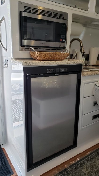 I decided to reinforce the fridge hinge with the LHC reinforcement bracket. Since my Dometic is the same primary design as the one that was in my Casita, I know the benefit of strengthening that part of the door. I've know a couple owners who have broken their door and Dometic's prices for parts is astronomical! I added the button guard in addition. As far as the fridge front, I added a metal decorative sticker to the front panel for aethetics and to try to keep the front from fingerprints. I just didn't like the black. I don't recommend the film I bought as it was a bear to install without a few bubbles and another person to help!