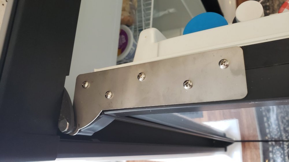 Has anyone modded the fridge door to stop it from swinging so far open? Whenever I have items to load into my Dometic, the door wants to swing way into the entryway that I'm afraid it's going to break off! I've already installed the reinforcement plate from Little House Customs on the top if the door but I'd like to have some kind of door stop in place. In my Casita, the flange on the outside prevented the door from swinging out like this. I thought about a nylon strap fixed to the bottom but I can't seem to figure out how to install it. Thanks in advance!