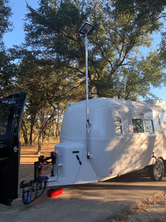 8. Unfortunately, no. We were scheduled to attend a gathering in Pennsylvania last week, but both Deb and I were still nursing a really nasty chest cold that dragged on for almost three weeks. Ugg! Next Tuesday we head out for a week in west-central Ohio, where I will experiment with the various setups I have. The section of Indian Lake State Park where a dozen or so of us are gathering is heavily wooded, so I doubt I'll be able to get any benefit from the mast. I'll likely have my 150' of Ethernet cable out trying to find a bit of open sky. I also recently grabbed a Makita battery adapter with the Starlink Mini cable as the output that offers yet another quickly deployed setup. I carry three Makita batteries and a charger in the trailer, so with the adapter, I can plug in a battery and toss the Starlink Mini anywhere and have service within its inbuilt wifi range. I have deployed the mast here at home. I already had a pair of SeaSucker 4.5" vacuum mounts that I was hoping to use with Flagpole Buddy's generic mount. But with the angles of the hull, there was no way that would have worked. I already know how well the SeaSucker mounts hold, and the 6" Airstream mounts from Flagpole Buddy are just as good, but bigger. I stuck both mounts on the rear, above the left turn signals and an even height above the belt. I bought two extra sections for 16' of height above the lower mount, so close to 20' overall. I left it on for about a week without once needing to pump in more vacuum. And every day I really tugged on the mast, and rocked the trailer to see if it would come loose. It worked great! I did find it a little finicky to get the correct angle on the two bases to get the mast vertical. But once aligned, I put a Sharpie mark at the top so that it will be easier the next time.