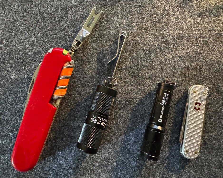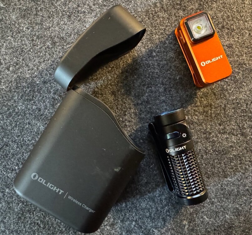 All that, and I realized that I didn't answer the question... Just like a knife or a camera, the best one is the one you have with you. So while my 40 year old Surefire is still my favorite flashlight, it is too bulky to have at all times. I don't carry a leatherman and a flashlight in belt pouches any more. So small, reasonably bright, and reliable are best for me. While I prefer a rechargeable flashlight, having a tiny AAA light and a spare battery in pocket covers most emergencies. I'm not sure when I last charged my pocket rechargeable. [putting it on the charger now!] The Olight i1R2 Pro and Victorinox Compact on the left hang loose in my pocket. This light is rechargeable and has 5 or 180 lumens as well as red. The Olight i3E EOS and Victorinox Classic Elox are kept in a small pocket pouch with spare battery, bandages, emergency pills, etc. This is a dead simple on/off 90 lumen AAA light with a usable spread. Below are the Olight Baton 4 Premium Edition, with rechargeable battery and stored in a recharging holder. It puts out 1300, 600, 300, 60, 12, and 0.5 lumens. One of these is in the armrest of the Land Cruiser, and another in the Oliver's nightstand. Also below is a tiny Olight Oclip rechargeable that puts out 300, 180,100, 10, and 1.5 lumens, as well as red. Deb has an Olight Seeker 2 Pro, which puts out an obnoxious amount of light at 3400 lumens, and has the best spread without any hotspot I've ever seen on a flashlight. She likes to sit around a fire while all the guys are showing how bright their flashlight is, and then casually turn hers on to Turbo mode, and completely obliterate them. She's mean like that. 😉 The current Olight Seeker 4 Pro is even brighter at 4600 lumens! Around camp I use a NiteCore NU25 rechargeable headlamp for hands free use. It is lightweight and has both a flood and spot reflector which can be combined for even more light. There's also a red light. Spotlight is 200 or 60 lumens, Floodlight is 200, 60, or 6 lumens, and combined is 400, 200, or 60 lumens. All of the rechargeable lights, as well as everything else rechargeable on our persons or in the truck or trailer are USB-C -