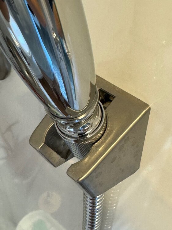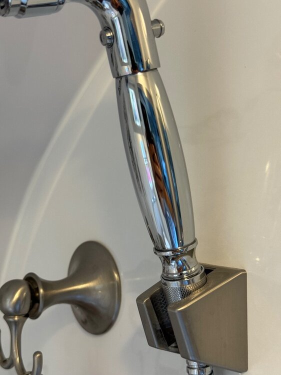 It fits. Sort of two orientations it’ll drop into at different angles. For reference, the top is about 2” from the ceiling I have the optional wall mount because I have all the components to do the separate shower valve and new faucet. But I haven’t gotten around to doing that yet. The adapter is a temporary step to use the shower head until I start that project. -