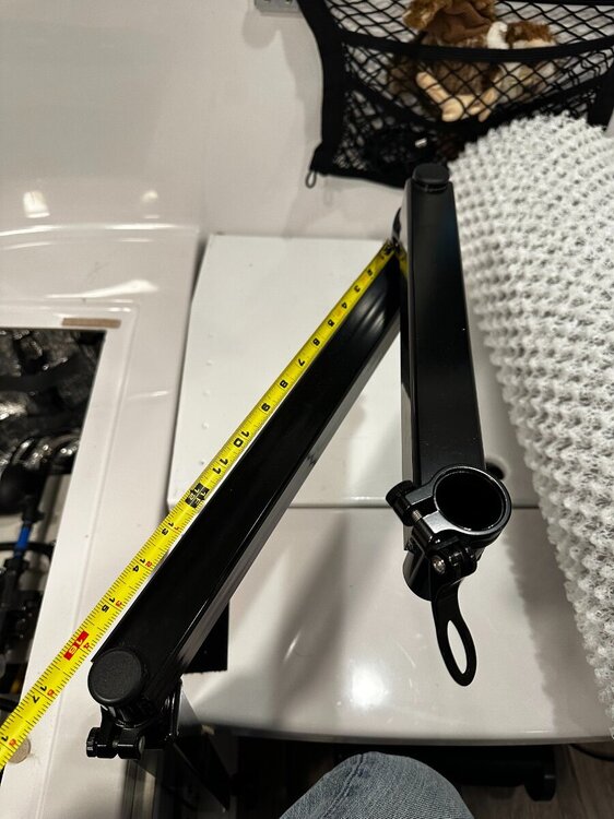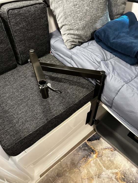 13. I’ve attached photos showing how I mounted the EZ Reach table system. To do this, I used a 12" x 16" aluminum sheet and aluminum L brackets. Additionally, I attached an angled brace from the top of one of the L brackets to the aluminum frame supporting the heater. The setup is very sturdy, and we’re pleased with how it turned out. For the EZ Reach system, we selected a 16" arm and a 12" arm to achieve the level of articulation we needed. The table top was purchased from Oliver. Note: We always remove the table top from the system while traveling. Hope this information is helpful!