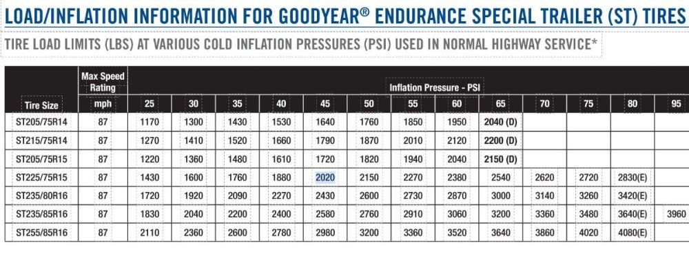 22. We have a 2023 Elite 1 with Goodyear Endurance ST225/75R15 tires. We were told to inflate to 65psi. I just found the load chart and it indicates that we should be inflating to about 45psi if I am reading it correctly. I am assuming the weight listed in the chart is per tire (so half the total weight). On the scale, the trailer weighs just under 4,000 lbs loaded. I uploaded a snippet of the load chart. Can someone confirm this?
