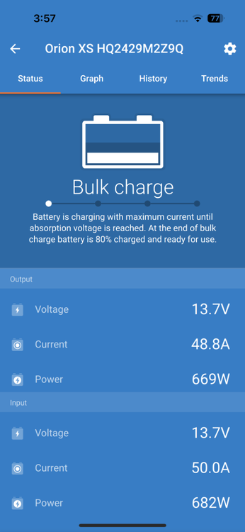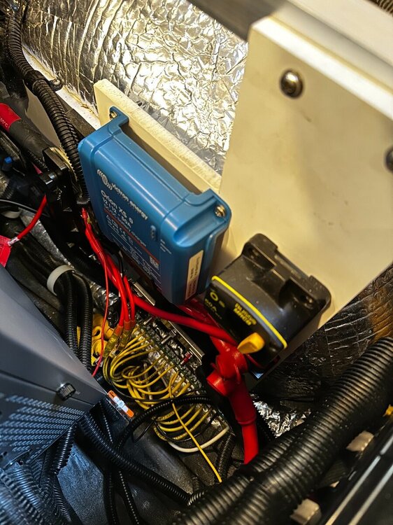 17. Just finished install of Victron Orion XS 12-12 50A charger in my Elite 1. Special thanks to Geronimo John for helping me with my project. His expertise was invaluable. And highly recommend Artek Energy in Milwaukie, Oregon where I purchased most of the components, parts, and materials. They went above and beyond with advice and even helped with the settings on my existing Victron MPPT Solar Controller and SmartBMV712. Everything is now working together smoothly and efficiently. At 80% SOC on the Lithium Batteries, the charger is pushing out 48.8 amps bulk charging at idle. Nice! Replaced OEM 100amp alternator with Mechman 240amp alternator. 1/0 marine grade tinned cable from alternator to battery and then back to Anderson SB175 connector. Then 1/0 to busbars in trailer and reduce to 6 gauge for short runs to/from components and batteries.