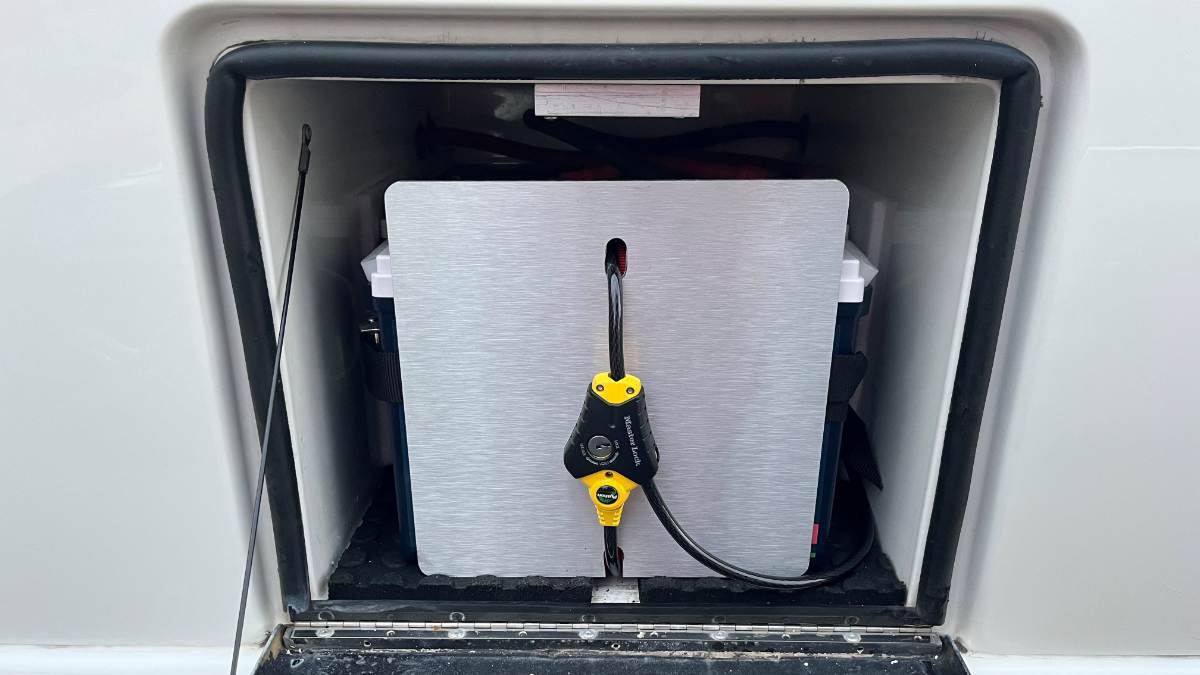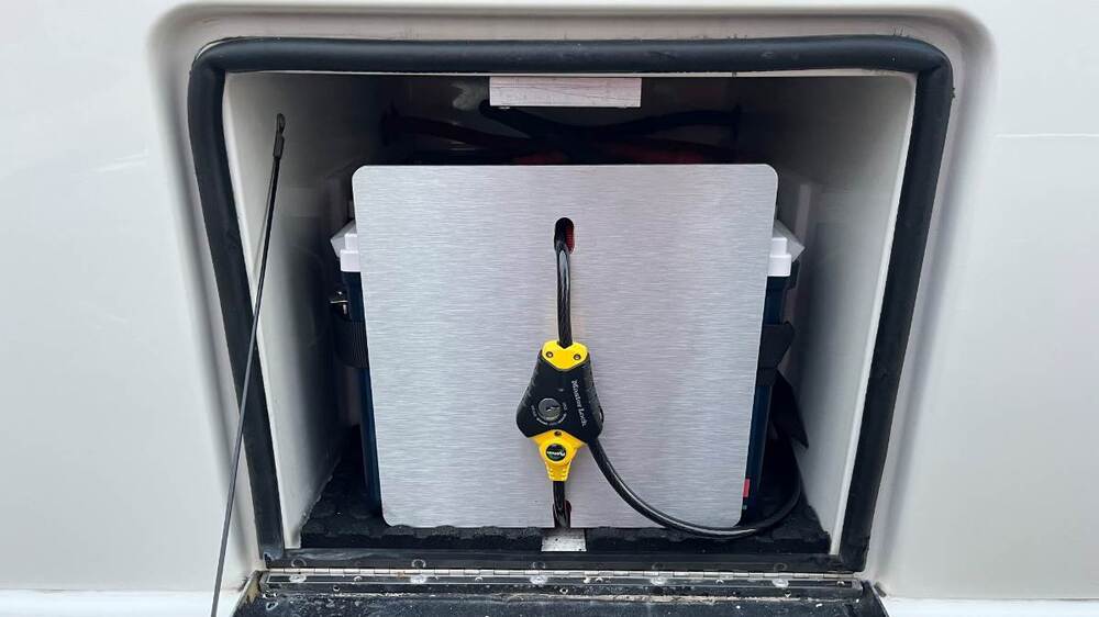 Once I got to this point, I started thinking a thief could possibly undo the battery cables, loosen the straps and even with cable lock in place, slide out the outer battery, then steal them all. Oh No! So, I had a 12x12x1/4" sheet of aluminum left over from another job and it became the perfect solution. Now besides a taking a crowbar to the battery door, a thief would have to cut the 3/8" hardened steel cable. Now these expensive batteries ain't goin' nowhere! I'll cinch down the straps and cable lock again, after putting on some miles... Ya gotta love the new look of our Epoch app! 900 Ah - Priceless! ๐
