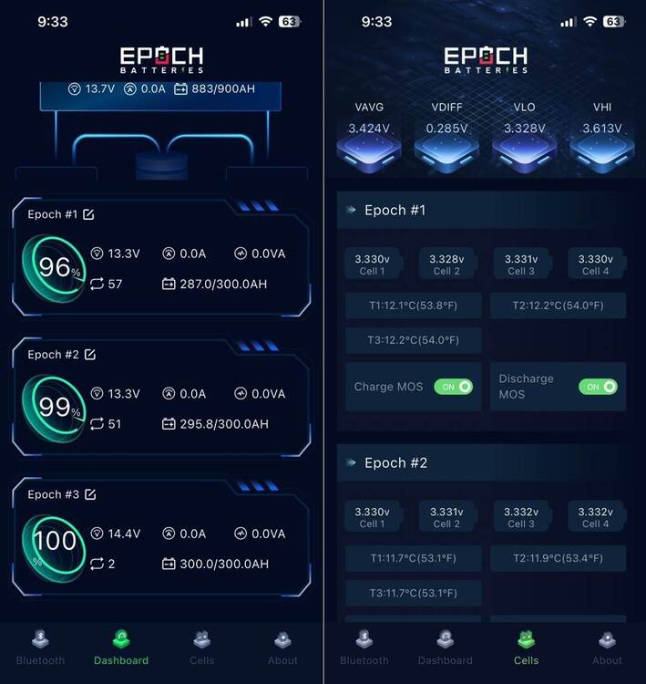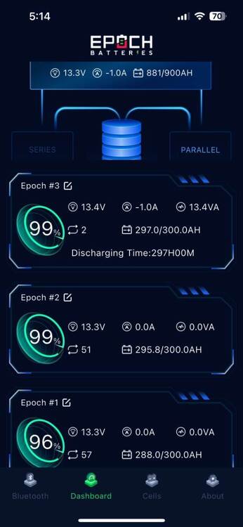 Thank you @T-Oliver, very nice. I didn't noticed the temps on the 3rd screen, with 3 temps per battery! This got me looking for more info on the Epoch app and I found this video quite informative: https://www.youtube.com/watch?v=SZprZ8ncWxs I see from your app screen-print, you have your batteries switched OFF. Perhaps for winter storage? I also did not realize you can do this from the app. If I turn all batteries OFF, would that be as good as disconnecting the main ground? I've physically disconnected several times for maintenance or installations. Looks that way, so cool! ๐ Our first two Epoch Essential 300s have been installed for 18 months always ON, Victron MP2 always ON and rooftop solar ON (unless I want to let SOC drop down when the Oliver is sitting at home). We use the Oliver year round, only connected to shore power during Aug for A/C. Notice our Batteries #1-2 have 51 and 57 cycles used (out of 4000)! Epoch #3 was just purchased, it arrived at 49% SOC and I had it on a small 10A charger overnight. Right now all 3 are sitting in the garage, so I could remove the battery tray for a new installation of 3 batteries. Can we stop worrying about SOC with 900 Ah? ๐คฃ Love this little charger, get one! I use it all the time in my garage and bring it on the road just in case. It can be switched from LA, AGM or LiFePO4, even 6V and repair settings for when a battery gets drained down completely (yes, the repair function works!): https://www.amazon.com/dp/B07W3QT226/ I have one of these wired to the tow vehicle so it can be charged without poppin' the hood: https://www.amazon.com/dp/B004LWWNLC/?th=1 No app for Battleborn with this kind of functionality? There certainly should be at the price point!
