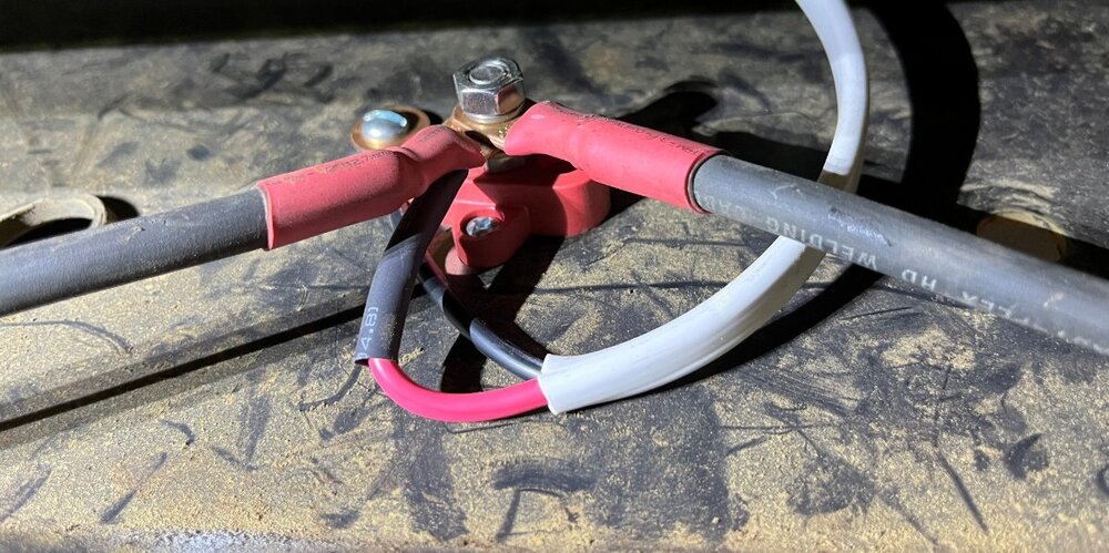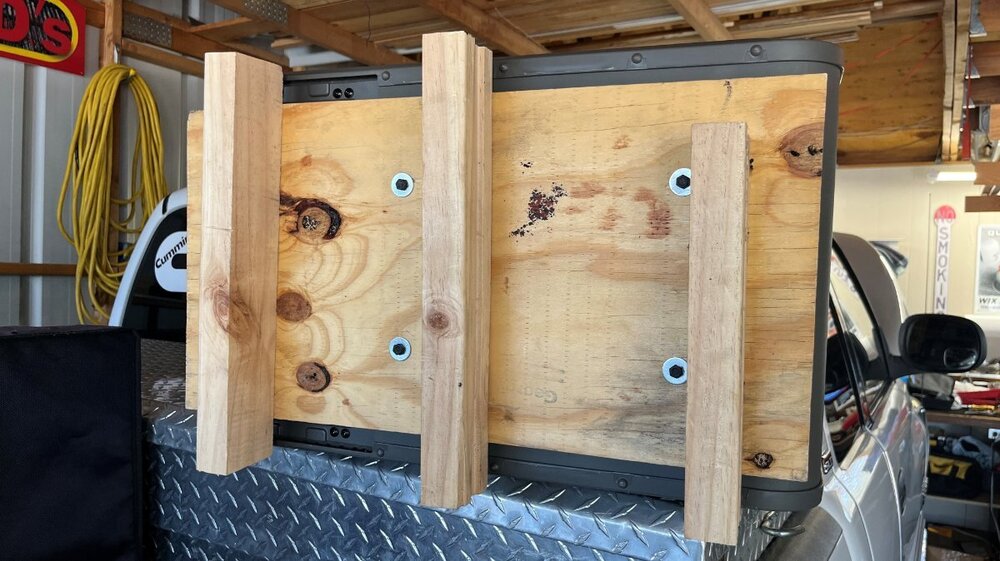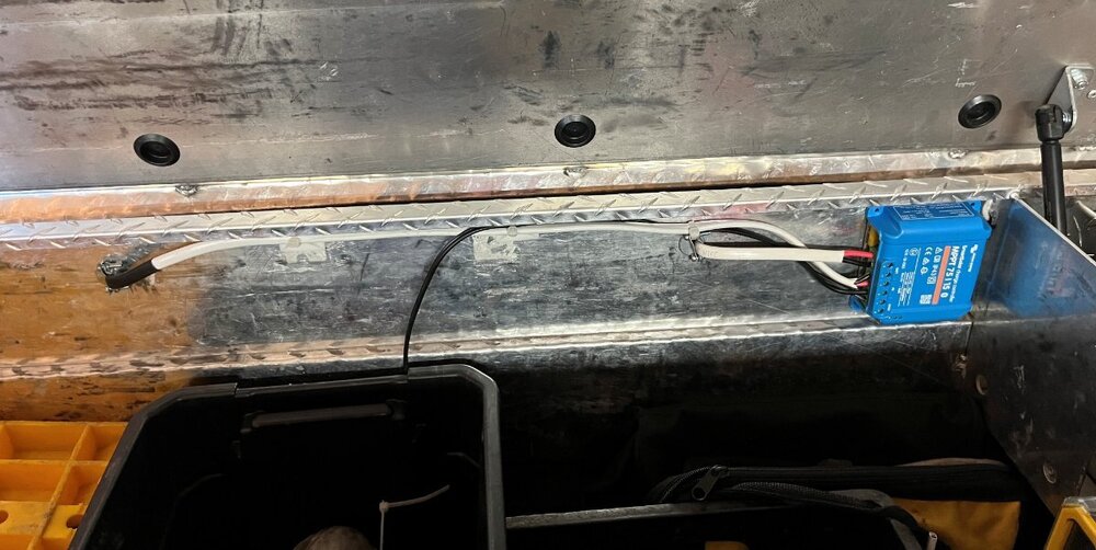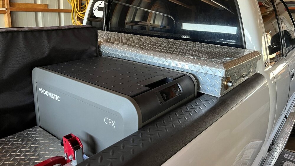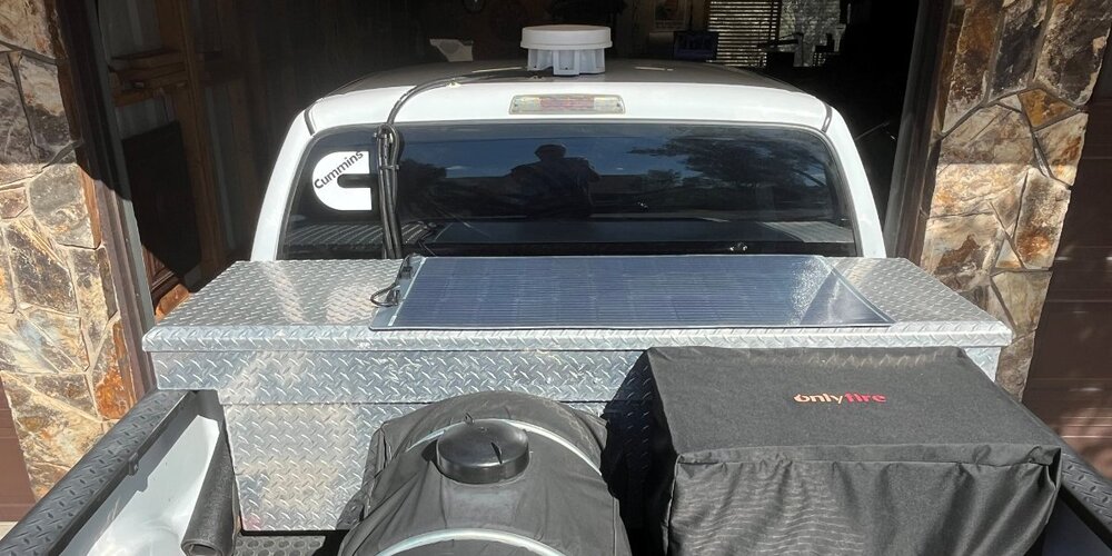 I came up with the idea to add a 100W Renogy flexible solar panel and a small Victron MPPT 75/15 SC. My goal was the solar energy should be enough to replenish the truck starter batteries while running the CFX5 refrigerator and our Pepwave router system. I had already upgraded the TV with a HO alternator and AGM batteries. The solar addition should keep my TV starter batteries fully charged, except in the mornings after running the router and fridge without sun overnight. After a few hours of late morning sun fully charged again. I have a spot in the bed where I could mount a second solar panel if needed. Those of you who have a truck cap should mount 2-3 of these 43x23” Renogy flexible panels in a heartbeat! I will share links for components used in a later post. I got the installation done Friday. I deleted the solar wire terminals and used butt crimp connecters and heat shrink adding a few feet of flexible 10/2 wire (left cable in the picture). The black wire pair is coming up through the bottom of the toolbox from the cooler. The short wire on the right exits the toolbox and goes stgright down to the frame where I intercepted the 4AWG wire from my DC2DC charger installation adding a simple single bolt buss for lowest possible resistance. Yesterday I thought I should trim the panel narrower. The Renogy panel is 23” wide and the standard truck toolbox is 21”. The job would have been easier if I had trimmed it before mounting it, but it came out very nice with a little extra effort. I used a boxcutter and a 1 1/4" bracket clamped to the edge of the panel and trimmed that amount off both sides, filing the edges smoothly afterwards. VHB tape was used to mount the solar panel to the toolbox lid and to mount the solar controller inside the box. I also purchased an inexpensive waterproof grill cover to protect the Dometic CFX5 cooler. They make an insulated cover for about $150 but I wanted more airflow than insulation and wanted a cover that would easily come off and on. I have a 1” piece of Styrofoam inside the cover to insulate the top from direct sun. -