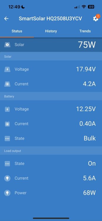 I’m really happy with the results! The 100W panel is regularly getting 70W, during the day, sitting flat, not angled to the sun. When getting high of 75W it handles the 5.6A required by the CFX5 with compressor running (observed 0A with compressor OFF, 3.7A lowest reading with compressor running and 5.6A highest reading), plus another +0.4A charging the TV starter batteries. This adds to 6A provided by solar. The Pepwave router was also running behind the scenes and it draws +/- 1A. This particular Victron SC has a terminal for 3 pairs of wires (see graphic). One pair for the battery (BATT), Solar Panel input (PV) and LOAD an output circuit. I thought this is a handy extra. I could have wired the CFX5 cooler to battery, but this LOAD circuit allows for special monitoring (the Pepwave is wired directly to the batteries). -