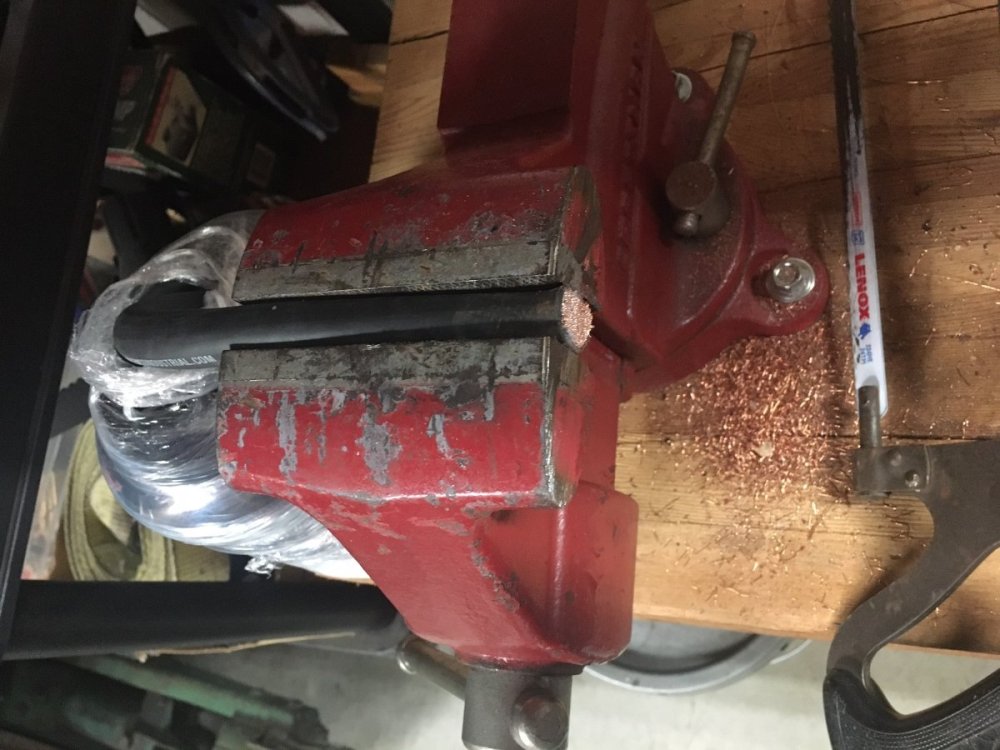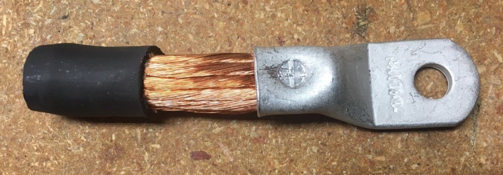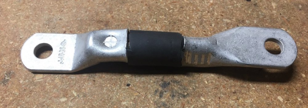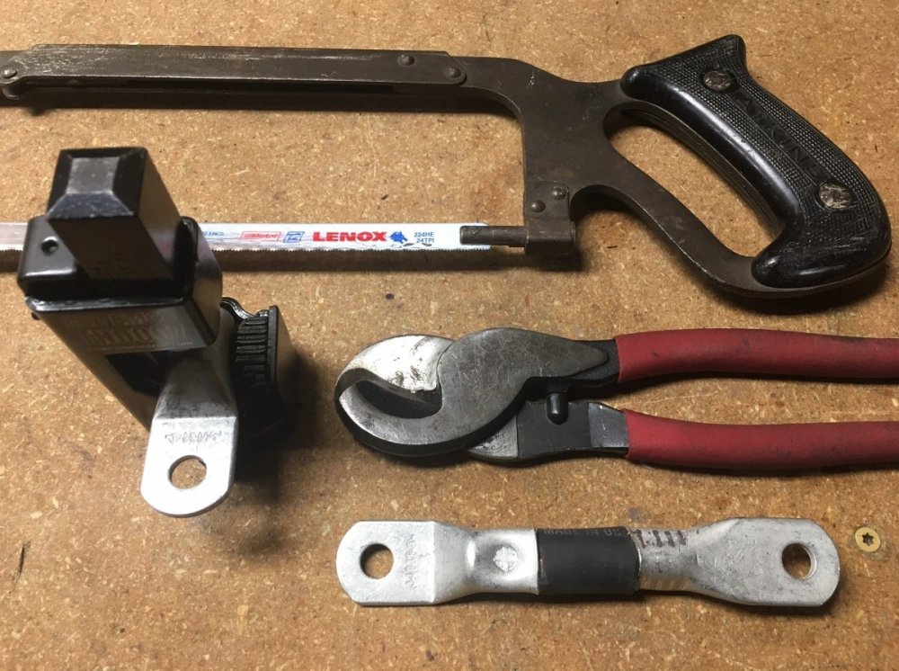 Recently purchased a Victron SmartShunt and I did not want to do a fancy install, perhaps later once upon a Lithium upgrade, but for now the shunt will be physically close as possible to the negative battery terminal. They don't sell shorty 4/0 AWG cables, as far as I can tell, and if you need a bunch of different sized cables, you can cut lengths to your needs and save money buying bulk cable and battery terminals (lugs). I installed the shunt last week to check it out, grounding it with two shorty 4AWG cables in parallel, because I had them on hand. Twas fine for the testing, but the cross-sectional area of the two 4AWG cables s is about 60% of one 4/0. Amperage capacity is directly related to the quality of the conductor (less resistance) and its cross-sectional area (more capacity). Cutting 4/0 cable is not easy. When I install an 1800W inverter 3 years ago, I used 2/0 and was able to cut that with the cutters shown. This tool is a bit dull and beat up because of that, and no way it was going through the 4/0. I put the cable on the vise and used the metal hand saw. Saw just touching the vise so that the cable stays put. A new fine steel blade would be best, fine since this is only copper. Today I crimped the shortest cable that I've ever made, only 5" long, hole to hole. The other thing is I customized it by turning the lug on one side 180 to the other side. This allows for a 1" height gain necessary to mount on the taller shunt (picture mounted later). I used Selterm brand tinned copper lugs, that are so big that the insulated wire between the lugs is only 1 1/4" long. It is extremely difficult to get all the copper strands into the lug, due to the sawed edges. Hammer the ends as round as you can before you strip the insulation, and then just strip a little at a time. I purchased TEMCo pure copper 4/0 welding lead "Made in the USA." The crimper tool is their brand too, that I had from last time. Some guys hammer this kind on crimper. But I prefer again using the vise. This is a tug! You'll need a strong extension bar to get the full crimp. The TEMCo HD crimp tool works great btw. I ordered heat shrink tubing which came in the wrong size, so later on that. Cool thing is 3" of heat shrink will go lug to lug on a cable this short, will show that later.