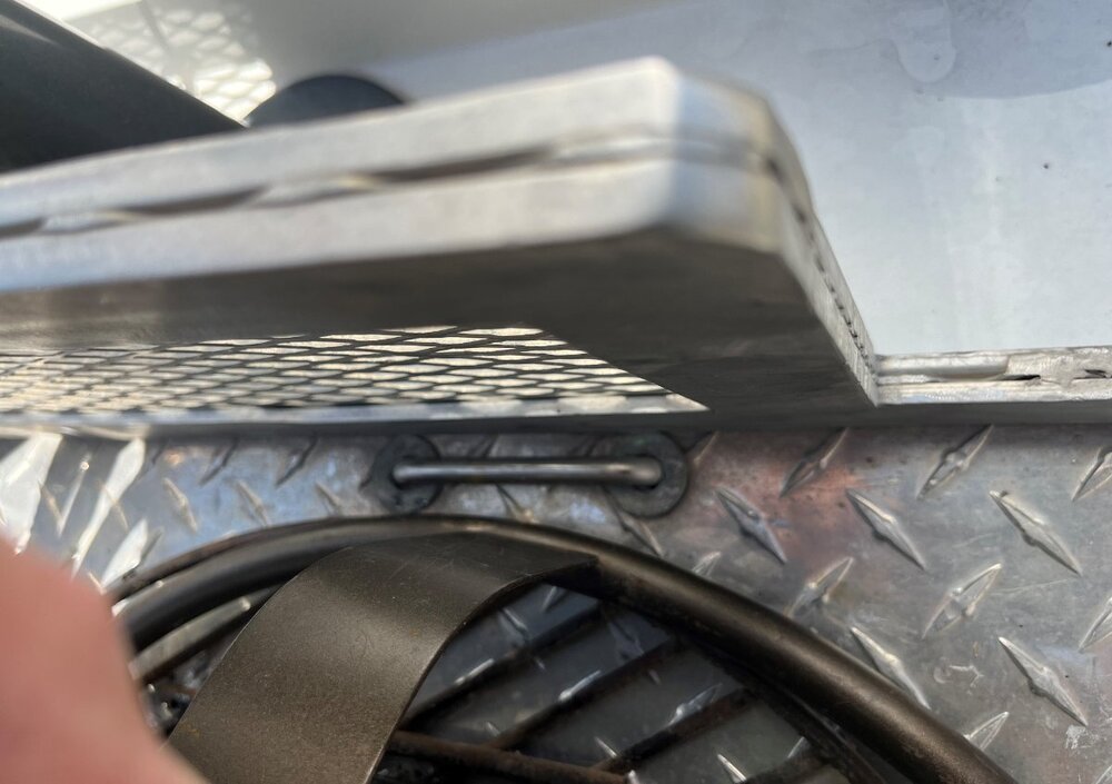 Looks like long rubber in the back, perpendicular to the trailer (see pic). The short piece parallel in front (mine looks like duct tape there).