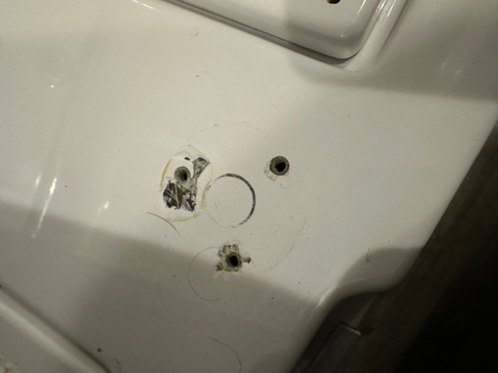 I got the front one out. I used a hammer drill to screw the bolts out (I couldn't budge them by hand). One seemed glued and two came out easily. I took a spackling knife and lightly tapped around the edges flat against the fiberglass, hoping to pop it off. It did come off, but with a little fiberglass damage - from some glue that was used? See the photos. I can put it back easily enough, but if the wall mounts are installed the same way (with bolts and nuts), I'd never get them back into place if I even managed to get the bolts out. I think I'll leave them alone. I noticed on the LE1 that is available in current inventory (Hull 1385 here) that the 10th picture shows that LE1 without the rail. I wonder if the mounts are there, but below the cushions? Or if they can leave the rail off at buyer's request. I'd be extra interested to know if it is bare fiberglass (no rail mounts) if they would offer to install a rail - and how they would do that!?! Geoff