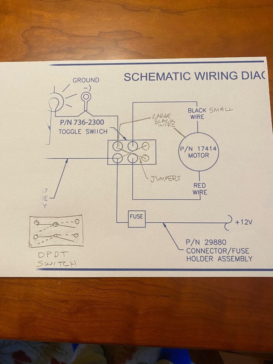Hi Chris, Iām sorry to read about your jack issues on the road! Iām a little late to the party, but I can offer some switching information and a troubleshooting procedure. Or I could swing by your house if you still need help when you return. I read back on this thread and noticed that the question of why the motor has 3 wires was never answered. Per the Barker schematic, it looks like the jack motor should have only two wires, so the third wire creates confusion. The smaller gauge black (-) and red (+) wires are the motor leads, the larger black wire is a second ground to ensure good grounding of the motor. The toggle switch is wired to reverse the polarity of the motors leads, which reverses the motor for up-down travel. Iāve never actually looked at the jackās toggle switches, but a reasonable guess is that they are DPDT (Double Pole, Double Throw) switches with a spring-back neutral (off) center position. They would have external jumpers that areāt seen in the Barker schematic. I filled-in the ālikelyā missing detail in the Barker schematic and included a sketch of the internal switching of a DPDT switch, the center row of terminals are common. Your rear jack doesn't include the head unit with the light, but the toggle switch should be the same. The fuse will be on the + feed wire, and the - ground terminates on the main ground bus with all the yellow wires. Oliver choose yellow for ground wires, but I donāt know if that holds true on older models too. Test across the two center (common) terminals with a multimeter in the dc volts setting. Use pointed probes being carful not to short across the switch terminals. You will need a second person to operate the switch: With the switch in center off position - 0 volts With switch down - around 12 volts With the switch up - around 12 volts (FYI - the polarity will be reversed). This will tell you if the switch is working, and if there is voltage to the switch. If the switch works, then the trouble is in the wiring between the switch and motor, or the motor itself. If there is no voltage on steps 2 or 3, then recheck the fuse and /or the wiring between the fuse and power source, or look for an open ground wire. Hope this helps ! Cheers! Geoff