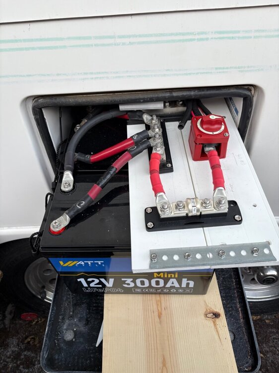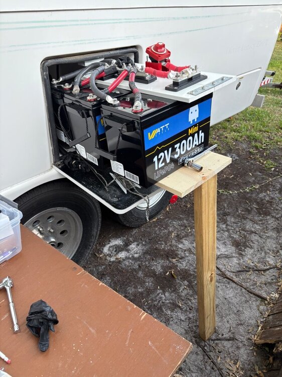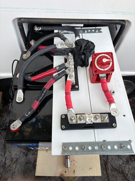 yes, the good news is Lithiums are a LOT lighter than the AGMs. But, at 57 pounds each, that’s 171 pounds for the 3. After reading about someone saying they felt like a “German Mechanic working on car” I came up with a Rube Goldberg solution. The original 4 AGMs were wired with no bus bars and no cut off switch. After seeing some sweet forum posts I decided to add the Blue Sea bus bars for Neg and POS, the 400 amp Blue Sea Fuse, and the Blue Sea Switch. (FYI, Blue Sea is very proud of their equipment and price it accordingly.) Using 4/0 welding cable, not the 4AWG from BatteryCablesUSAA.com that I ordered by accident, I realized it would be really hard to do this in the box. (By the way, BatteryCablesUSA not only refunded me for the wrong size cables I ordered, but helped me get the right ones, and 2 day shipped them in time to get them installed before putting the new Victron Multiplus in Monday.) See the pics below where I used the Loews what ever board, not the expensive board Oliver uses. thanks Forum. I wired the 3 Watt Cycle 280Ah, (not 300Ah, like it says on the label) on the table and made sure I had all the spacing right. Then disconcerted and put them on the board with the PVC pipe as rollers and hooked them up, Worked pretty well, except for the Blue Sea On/Off switch. It was almost too tall with the board and pvc rollers. (If you try this, use smaller pvc or a 1/2 inch board.) Good news is it’s all hooked up and good to go. Will update when the new Victron MP gets installed. I could not have even considered doing this if it had not been for the wonderful detailed posts other owner have posted and great responses to my questions. Oliver is a Great Trailer, and even better, because of the wonderful owners on the forum that support newbies like me. Thanks Gary