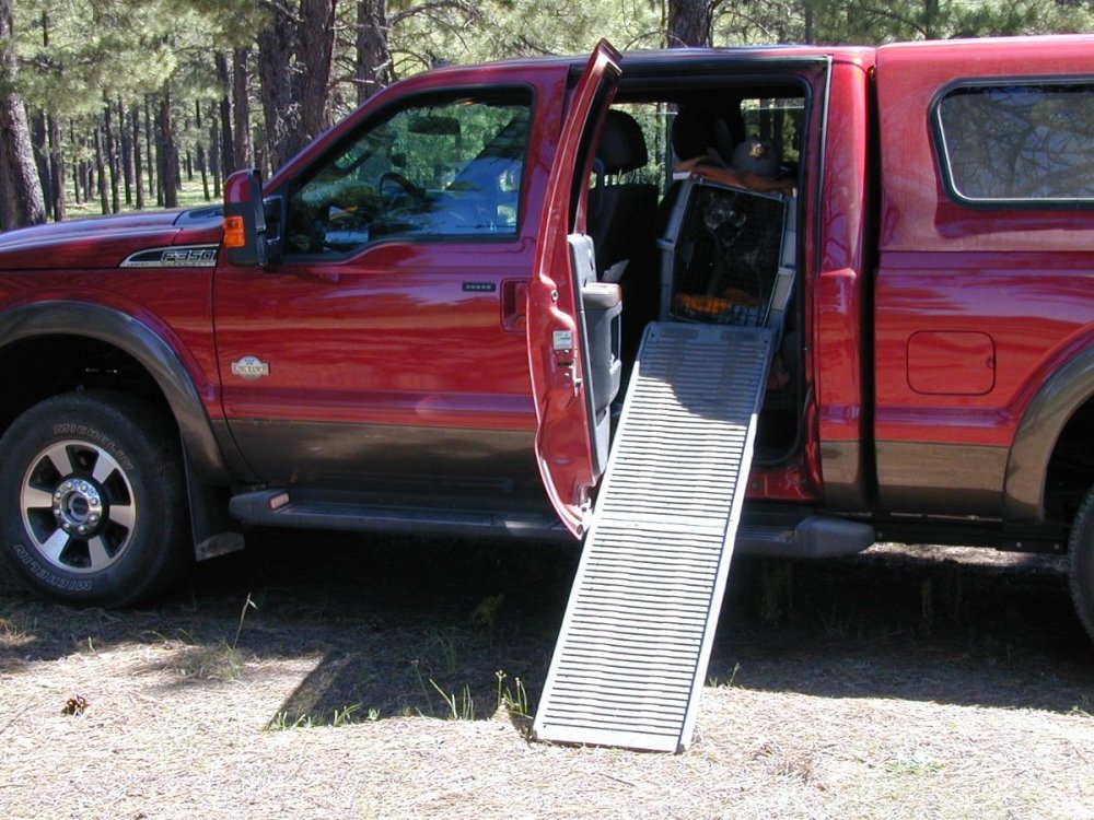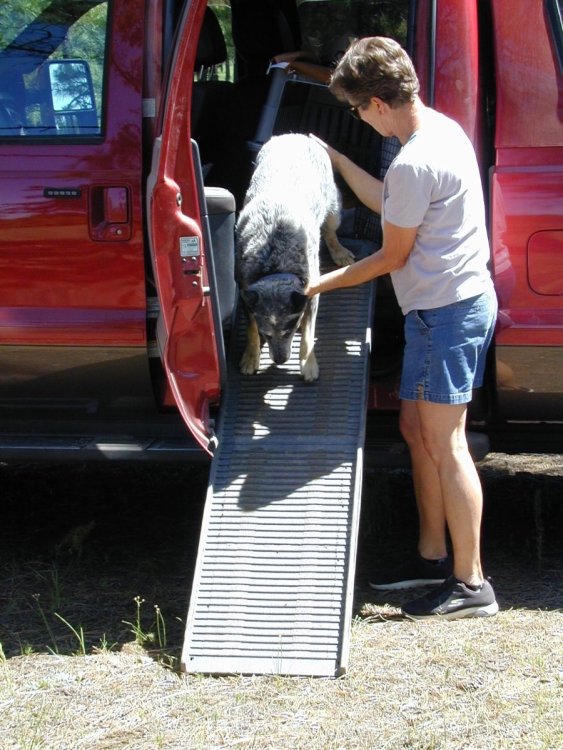 We travel with two Blue Heelers. They travel in Pet Porters on the back seat, with a blanket folded on the seat to protect wear and tear. When loading our Heelers, I extend the Petstep to their Pet Porter and each Heeler is happy to walk up the ramp and into their Pet Porter. The Petstep is also convenient to use for access in and out of our trailer. We raised our trailer with a 3 inch lift and swapped out from the stock 15 inch tires to 16 inch Michelins. This raised the first step higher and the Petstep is good for Human Beans, as well. The Petstep was purchased some years ago, so you will need to search the Internet. It is 72 inches long unfolded, 36 inches folded at the hinge and 17 inches wide. I keep it in the back of the tow vehicle and pull it out at Service Station stops and anytime have traveled some time and we all need to get out and stretch our 8 legs. It will take a few prompts to push the back of your dog to get the idea... and they catch on quickly. I did, myself when adapted the ramp into our trailer. When using the Petstep as a ramp access to your Oliver, I place a small footstool support near the middle of the ramp to reinforce it. If you dog(s) jump out of the Pet Porter, they will step onto the edge of the door frame, first. Then quickly go forward with their front paws to the ground. We do not want to injure the shoulders of either of our 'working dogs'. We may walk miles when we hike to explore areas we chose on a map as a 'places of interest'. Your Dog will quickly adapt and it even works for us. You may notice we have two Solar Panels mounted on the roof of the trailer and I added a portable from Costco (100 watt with Controller included for $99.00) for EXTRA charging. When our AGM Interstate batteries are fully charged, the remote shuts off the power to the batteries... all... by itself. Just a FYI. I am posting this for your Dog. This is not some kind of advertisement. Your dog will lick you when you least expect it... and a ramp.