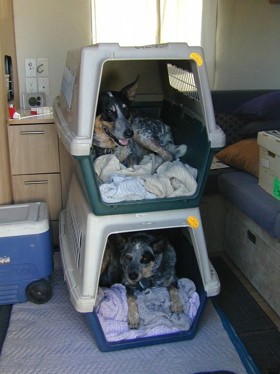 5. This is how we 'stack and pack' our two Australian Cattle Dogs, aka Blue Heelers. They travel in their Pet Porters on the back seat of our truck. This is their 'den' and they cannot wait to get into their own Pet Porter when traveling. Same when the porters are stacked in the trailer with limited space. One is the UP dog and the other is always the DOWN dog. Now we have one pillow under the dinette tale and the other in the hallway for evenings. The favorite spot is under the table, so the Early Dog gets the Den. What is your mode of transporting Dog(s), Cat(s)... or mice?