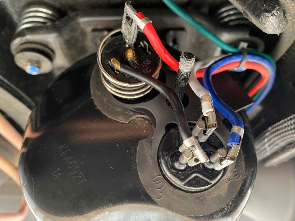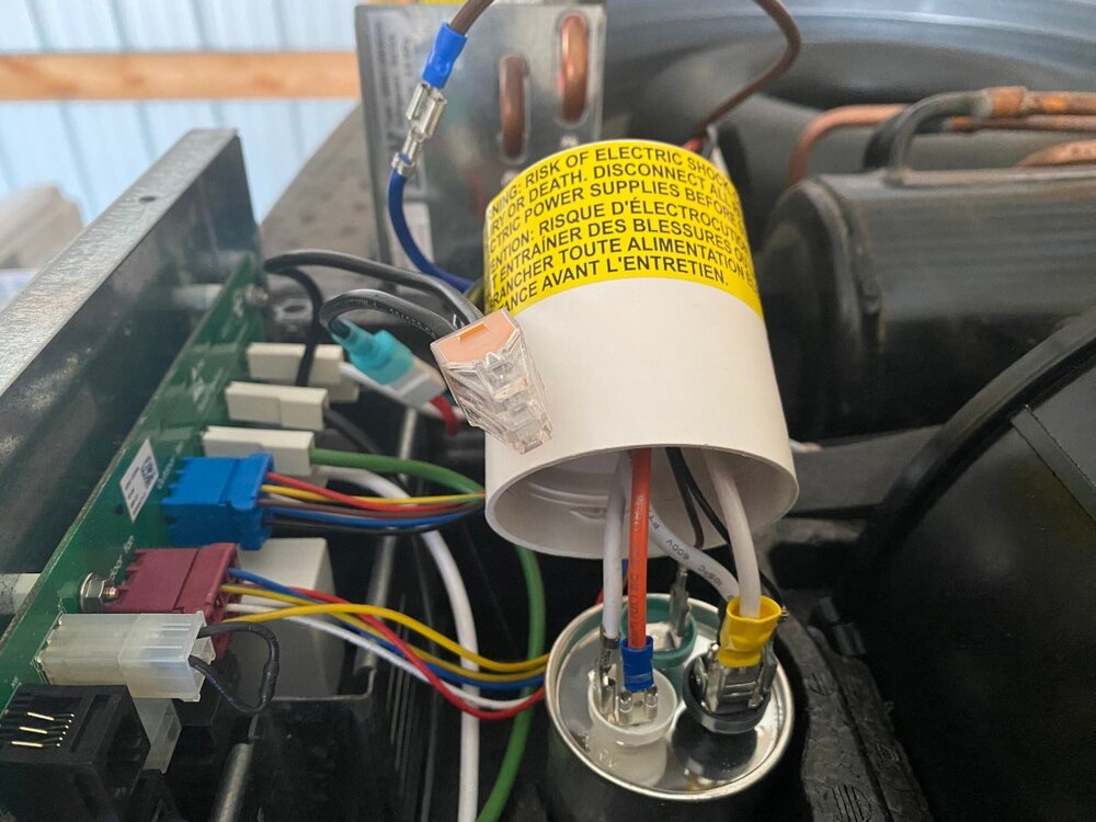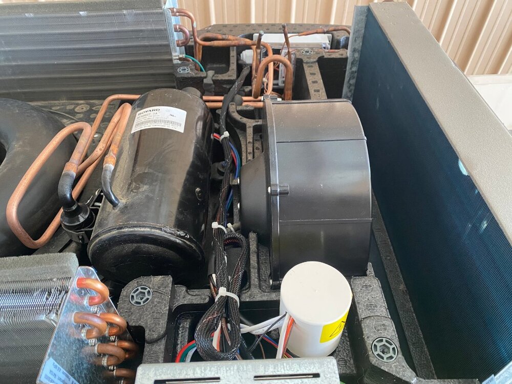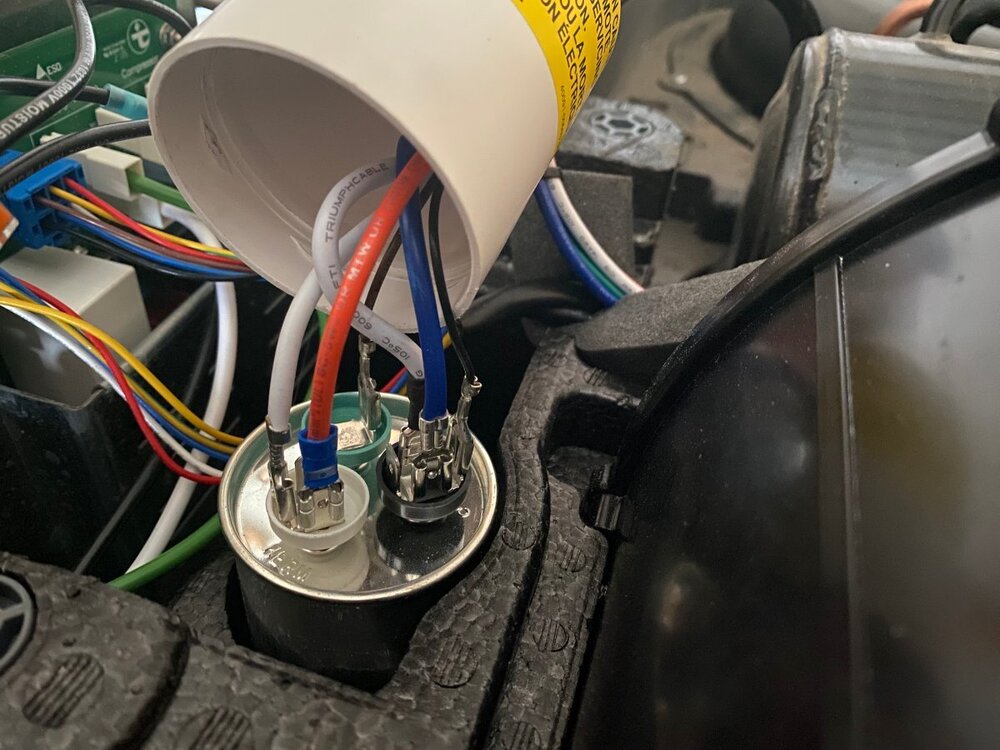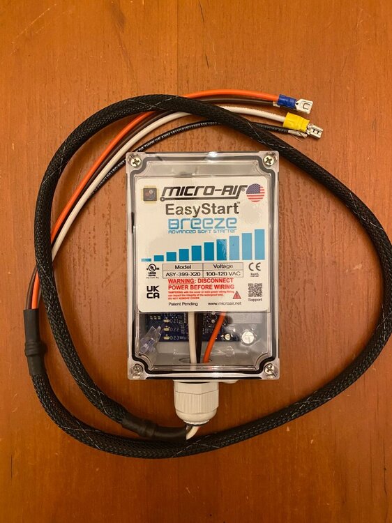 Since purchase of my OTT last year, I had been thinking of installing a MicroAir EasyStart on my Truma A/C. However, I wasnāt sure if it would allow my Truma A/C to run off my Champion 2000W generator, especially since I run it on propane and often camp at elevation. Fortunately for me I met @mossemi at the Oliver Rally last May and it turns out that he has the same generator and like me, runs it on propane. He told me that with the EasyStart, his A/C ran fine off his generator even at elevation. Thanks to Mike for that info. So now you can imagine my excitement when they announced that there were going to be ten EasyStarts given away at the Rally! But alas, I was not one of the winners. However, I met a nice couple from Oklahoma who did win one. And as luck would have it, they had decided not to use it, so they graciously gave it to me! Although I made several attempts, they refused any compensation. So I owe them a big thanks. Below are the details of my installation. First, thanks to @Patriot for previously posting this video: SoftStart Install on Truma A/C I found it to be very helpful for understanding how to remove the A/C covers, where to mount the EasyStart, how to run the wiring, how to get access to the control board and for making connections to the capacitor. However, DO NOT follow the detailed wiring instructions because the video is for a SoftStart not an EasyStart. Next, a couple of thoughts on safety. After I removed the A/C cover I found an old mud dauberās nest. Fortunately it was not inhabited at the time. But they seem to like that area, so beware. Second, the video doesnāt mention it but you should make sure that the capacitor has been discharged before working around it. Since Iām not a qualified electrician, I wonāt comment any further. Finally, I used my 17ā Werner ladder to get access to the roof. The optional Werner platform made this much easier. Also, accessing the roof from the curb side felt safer since the awning acts as a short railing. I used a sheet of rubber tool box liner and a piece of interlocking foam utility mat to protect the fiberglass and provide slip protection. With those additions, I felt safe enough to work in my stocking feet. As shown in the video, the white cover can be taken off by removing the eight screws (covered with lap sealant) with a T30 Torx driver (note that the two screws at the back are shorter than the others). Following that, removal of two additional T30 screws allows the foam cover to be lifted off. Be careful as you work with the cover off because the exchanger fins are easy to dent. Access to the silver electrical box is achieved by removing three T15 screws (one on top, and one on each side). Hereās the EasyStart device that I installed and the universal installation kit that comes with it: In general, I followed the wiring instructions provided by Micro-Air. I will say that I found the generic wiring instructions to be a little confusing (did I mention that Iām not a qualified electrician?). However, I was able to find specific wiring instructions for the Truma (that even I could understand) here: EasyStart Wiring Instructions for Truma A/C Although not necessary, I first removed the cap covering the wiring connections to the compressor motor with an 8 mm socket to confirm the wiring colors at the R, C and S terminals. (I don't know why but this photo is upside down and I couldn't figure out how to change it). I did deviate slightly from the installation instructions in one aspect, as I chose not to cut any wires but instead use terminal connections. That way, if I ever decide to remove the EasyStart, I can put everything back exactly the way it was. So instead of cutting the Red wire coming from the control board, I removed it and installed the provided 14 gauge Black wire with female terminal in its place. I then cut the Black wire and crimped on a male terminal to the portion not used and connected it to the female terminal on the Red wire that I had just removed. Finally, I used a WAGO push-in wire connector to tie these two to the black wire on the EasyStart. Next, after removing the white cap from the run capacitor, I installed the Orange wire from the EasyStart onto the Herm terminal next to the White wire. Then, I removed the Blue wire from the capacitor terminal and replaced it with the White wire from the EasyStart. Finally, I connected the Blue wire that I had just removed to the Brown wire from the EasyStart. Hereās a look at the wiring after everything was tidied up with zip ties: Overall, Iām pretty happy with the installation. However, looking back there is one thing that I wished I would have done and that is to add a bit of HVAC tape to the top of the EasyStart to give some additional support. Iām not sure how well the double sided tape will hold to the foam, especially given the conditions that some of our roads are in. Iāll probably go back and do that at a later time. BOTTOM LINE: After the install of the EasyStart, I noticed a very gradual ramp up of the compressor, as expected. More importantly, I can report that my Truma A/C runs very well with my 2000W Champion generator running on propane, even at 6000ā elevation. Added bonus: Unlike before, I can now run the A/C off my 15 A circuit at home. If you have any questions about this install, feel free to comment below.