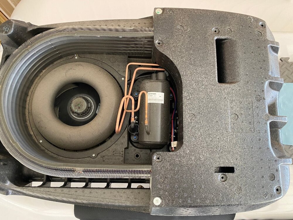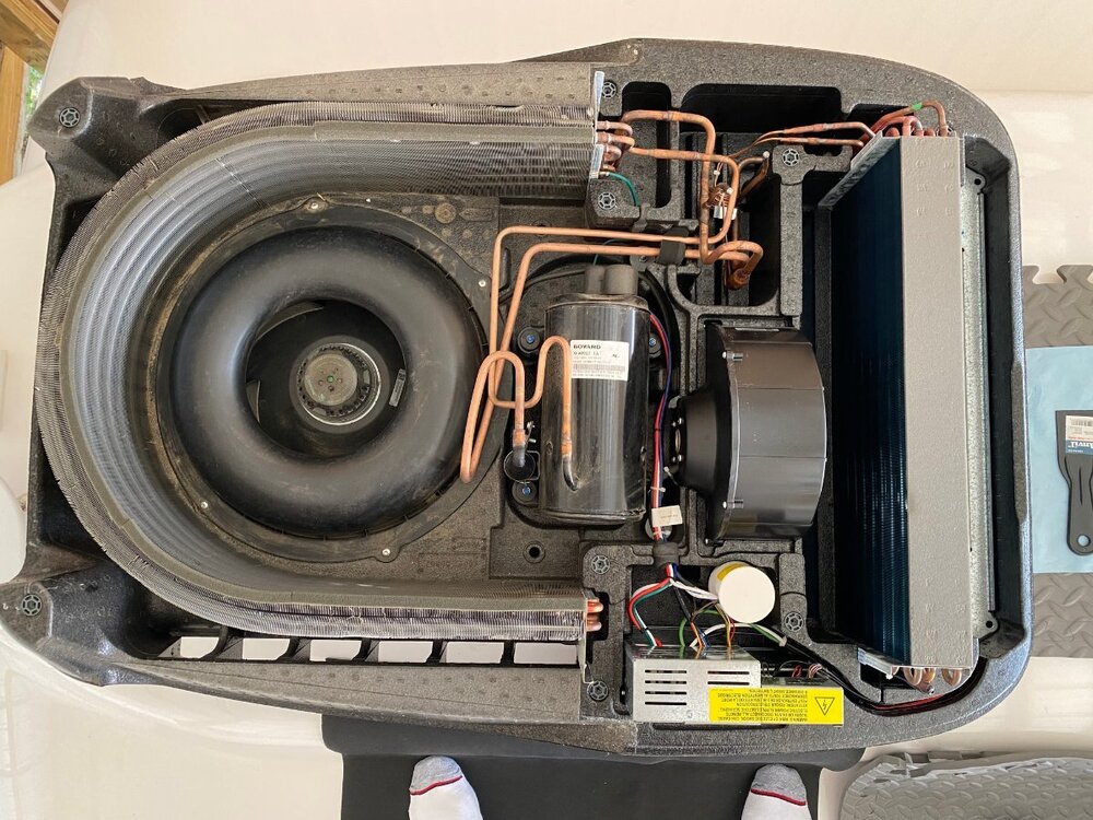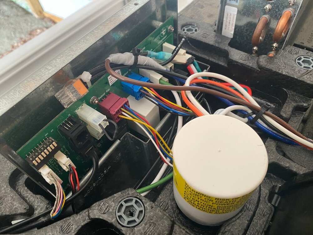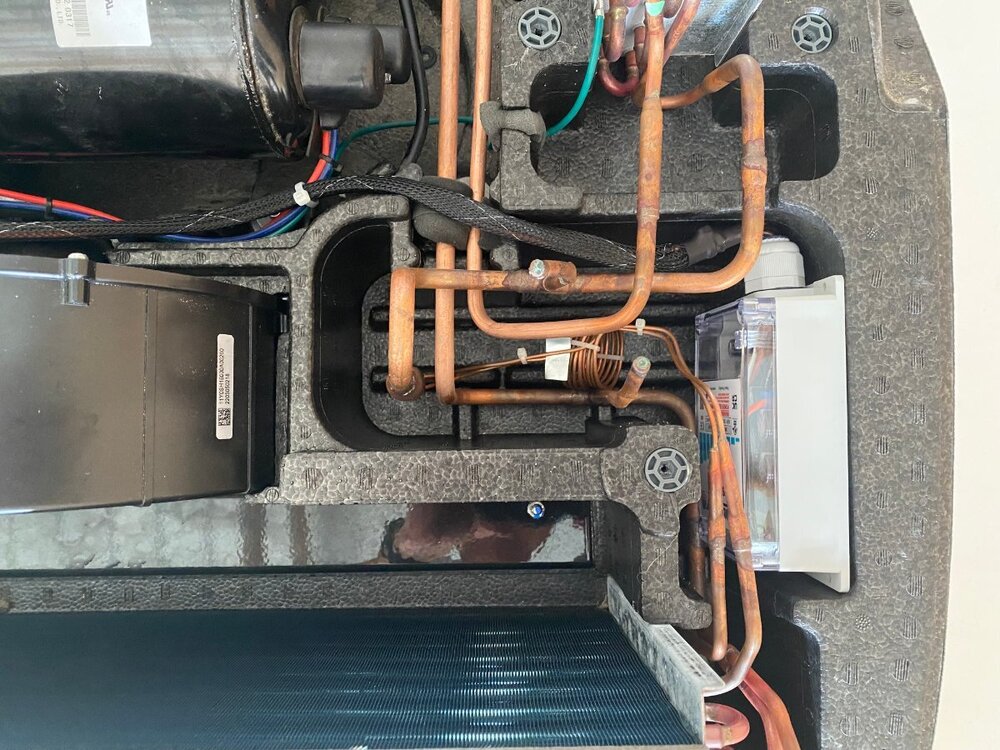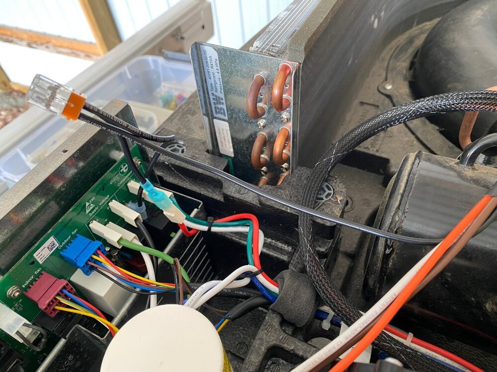 Since purchase of my OTT last year, I had been thinking of installing a MicroAir EasyStart on my Truma A/C. However, I wasnāt sure if it would allow my Truma A/C to run off my Champion 2000W generator, especially since I run it on propane and often camp at elevation. Fortunately for me I met @mossemi at the Oliver Rally last May and it turns out that he has the same generator and like me, runs it on propane. He told me that with the EasyStart, his A/C ran fine off his generator even at elevation. Thanks to Mike for that info. So now you can imagine my excitement when they announced that there were going to be ten EasyStarts given away at the Rally! But alas, I was not one of the winners. However, I met a nice couple from Oklahoma who did win one. And as luck would have it, they had decided not to use it, so they graciously gave it to me! Although I made several attempts, they refused any compensation. So I owe them a big thanks. Below are the details of my installation. First, thanks to @Patriot for previously posting this video: SoftStart Install on Truma A/C I found it to be very helpful for understanding how to remove the A/C covers, where to mount the EasyStart, how to run the wiring, how to get access to the control board and for making connections to the capacitor. However, DO NOT follow the detailed wiring instructions because the video is for a SoftStart not an EasyStart. Next, a couple of thoughts on safety. After I removed the A/C cover I found an old mud dauberās nest. Fortunately it was not inhabited at the time. But they seem to like that area, so beware. Second, the video doesnāt mention it but you should make sure that the capacitor has been discharged before working around it. Since Iām not a qualified electrician, I wonāt comment any further. Finally, I used my 17ā Werner ladder to get access to the roof. The optional Werner platform made this much easier. Also, accessing the roof from the curb side felt safer since the awning acts as a short railing. I used a sheet of rubber tool box liner and a piece of interlocking foam utility mat to protect the fiberglass and provide slip protection. With those additions, I felt safe enough to work in my stocking feet. As shown in the video, the white cover can be taken off by removing the eight screws (covered with lap sealant) with a T30 Torx driver (note that the two screws at the back are shorter than the others). Following that, removal of two additional T30 screws allows the foam cover to be lifted off. Be careful as you work with the cover off because the exchanger fins are easy to dent. Access to the silver electrical box is achieved by removing three T15 screws (one on top, and one on each side). Hereās the EasyStart device that I installed and the universal installation kit that comes with it: In general, I followed the wiring instructions provided by Micro-Air. I will say that I found the generic wiring instructions to be a little confusing (did I mention that Iām not a qualified electrician?). However, I was able to find specific wiring instructions for the Truma (that even I could understand) here: EasyStart Wiring Instructions for Truma A/C Although not necessary, I first removed the cap covering the wiring connections to the compressor motor with an 8 mm socket to confirm the wiring colors at the R, C and S terminals. (I don't know why but this photo is upside down and I couldn't figure out how to change it). I did deviate slightly from the installation instructions in one aspect, as I chose not to cut any wires but instead use terminal connections. That way, if I ever decide to remove the EasyStart, I can put everything back exactly the way it was. So instead of cutting the Red wire coming from the control board, I removed it and installed the provided 14 gauge Black wire with female terminal in its place. I then cut the Black wire and crimped on a male terminal to the portion not used and connected it to the female terminal on the Red wire that I had just removed. Finally, I used a WAGO push-in wire connector to tie these two to the black wire on the EasyStart. Next, after removing the white cap from the run capacitor, I installed the Orange wire from the EasyStart onto the Herm terminal next to the White wire. Then, I removed the Blue wire from the capacitor terminal and replaced it with the White wire from the EasyStart. Finally, I connected the Blue wire that I had just removed to the Brown wire from the EasyStart. Hereās a look at the wiring after everything was tidied up with zip ties: Overall, Iām pretty happy with the installation. However, looking back there is one thing that I wished I would have done and that is to add a bit of HVAC tape to the top of the EasyStart to give some additional support. Iām not sure how well the double sided tape will hold to the foam, especially given the conditions that some of our roads are in. Iāll probably go back and do that at a later time. BOTTOM LINE: After the install of the EasyStart, I noticed a very gradual ramp up of the compressor, as expected. More importantly, I can report that my Truma A/C runs very well with my 2000W Champion generator running on propane, even at 6000ā elevation. Added bonus: Unlike before, I can now run the A/C off my 15 A circuit at home. If you have any questions about this install, feel free to comment below.