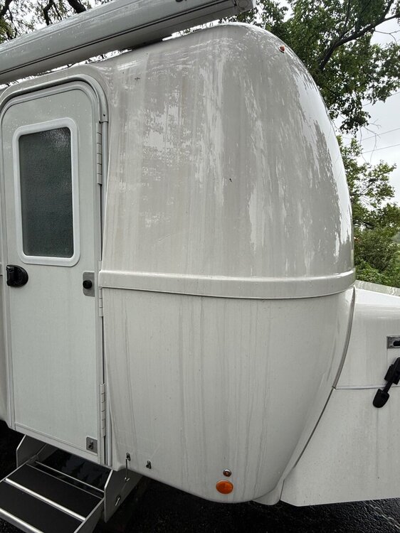 Well Ollie folks, I got tired of the brown trickles that were coming down over the fridge vent panels and rearward edge of the door from where the rubber seal had detached from the camper body and leaked the brown water from behind the awning. I purchased a new 20’ seal through Amazon - looks like the same exact thing. Pulled the old one off yesterday. Peeled and “rolled” off 99.5% of the old double-sided tape that held it on. (Got a blister on my fingertip from the technique I found to be effective. And then, took my soapy water and assorted brushes to clean the residue an dirt from the former dam created. It came cleaner than I expected. No staining from crud that had built up. All that remains are a few small traces of adhesive that I planned to attack with 79% isopropyl alcohol today. ”Today” decides it’s gonna be a rain day. Bummer. Went outside to do some unrelated chores and was surprised/horrified by what I saw. Multicolor streaks down the side of the trailer! Really surprising as there was really nothing left to run down the side. That, and I had rinsed the whole area and whole side of the camper yesterday. This sucker was CLEAN yesterday and there was no crud left to drip down the side. There was a speck or two of leaf/tree litter, but no streaks of stains or anything. The masks don’t easily wipe or rub off. I am under some trees right now. I’m probably gonna have to use something with a little polishing ability to get it off. Anybody else seen this appear on an otherwise clean camper during/after a rain? I typically use blue Coral cad wash to do regular washing. Though I haven’t used it on the rest of the trailer, I’m using a product on the bug-prone “nose” of the trailer (and front of my TV) that is recommended to make bugs less likely to stick. That stuff seems to work. Im gonna try some StarBrite and Maguires wash and cleaner/wax products to attack these new stripes. Any other suggestions? BTW - I had decided to pass on installing the new rubber seal - but if this is what I have to look forward to - I’ll likely reverse that decision.