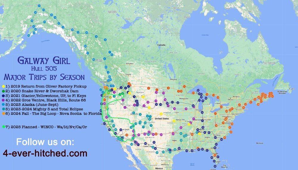 I sent a message asking the folks at RV Trip wizard if they had a feature to overlay multiple trips on one map...and they said no but to try exporting to Google Maps and using layers....here's a result as an example of what's possible, I'm still learning. So Google Maps allows direct import of the .gpx files that are output by RV Trip wizard. Normally the .gpx are used to load into Garmin devices, but Google Maps reads them as well. I started by opening up a new map in Google Maps created "My Map" as a BASE map with the first 2019 trip where we picked up the trailer, and added a layer for each subsequent main trip. I found that 6 is the maximum number of individual layers you can add in Google Maps. There are controls to change the type of marker, color, line width etc. There are also controls to turn on/off the titles for each stop. To create more graphic maps, Google enables embedding photos by geotag into the maps as well. I'm considering adding pictures of each campsite for each stop to see if it's at all useful. The map below lets us see big holes in our travel...so we've still got miles to go before we sleep! Craig & Rose Hull 505 - Galway Girl