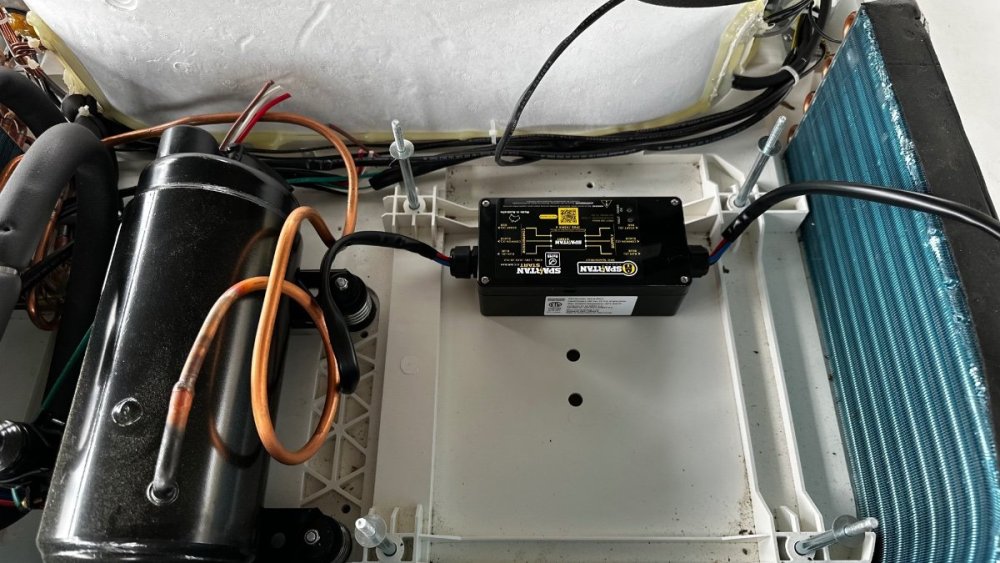 GSMBear Posted April 10, 2024 Posted April 10, 2024 Yesterday, I installed a Spartan Power Soft Start in my RecPro/Houghton A3400 air conditioner. It's identical to the one RecPro sells and is $100 cheaper on Amazon at https://a.co/d/cvYZV39. The wiring method on this one is different from other popular models. I've done both now and this one is much simpler. I removed the fan and found a place mostly out of the way underneath it on a flat surface. All you have to do is use your finger to trace the wrapped set of wires coming out of the compressor to a point where you can cut them. There will be 3 wires: red, white, brown. After snipping the wires, the 3 that are still connected to the compressor get connected to the "compressor" side of the Soft Start. The 3 remaining wires on the other side of the snip location get wired to the "supply" side of the Soft Start. Red-to-Red, Blue-to-White, and Black-to-Brown. Button it up and let it run for 30 minutes with the temperature set close to the interior temp so that it will cycle on/off a few times. Then good to go! I had no trouble when mine cycled on while the microwave was running. The combination of these two puts me near my limit of 30 amps so it will depend on what else might be running. The refrigerator was off and if it had been running, that might have put me over the limit. It's a balancing act, for sure. The picture with my fingers shows the snipped wires that lead back to the compressor. The other end of the same snipped wires represent the "supply" side. The other picture shows the mounting location which is accessed by removing the 4 nuts that secure the large black fan. Clean the surface with some rubbing alcohol first then peel the double stick tape and press it down. 1