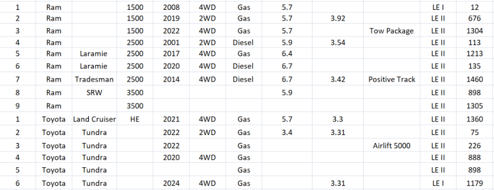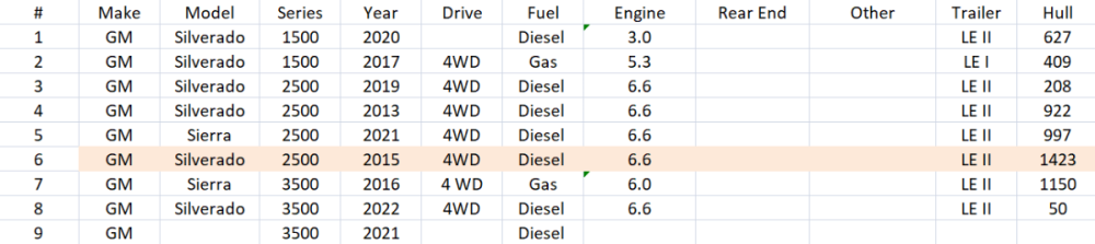 HDRider Posted February 6, 2024 Author Posted February 6, 2024 Sorted by make, series & fuel type - Let me know if you want another view of the data - I will keep adding to the data as long as people want to share their info. 1 Jeff & Cindy - NE Arkansas - 2023 Legacy Elite II - Twin Bed - Hull #1423 TV - 2015 Silverado 2500 Duramax 4x4